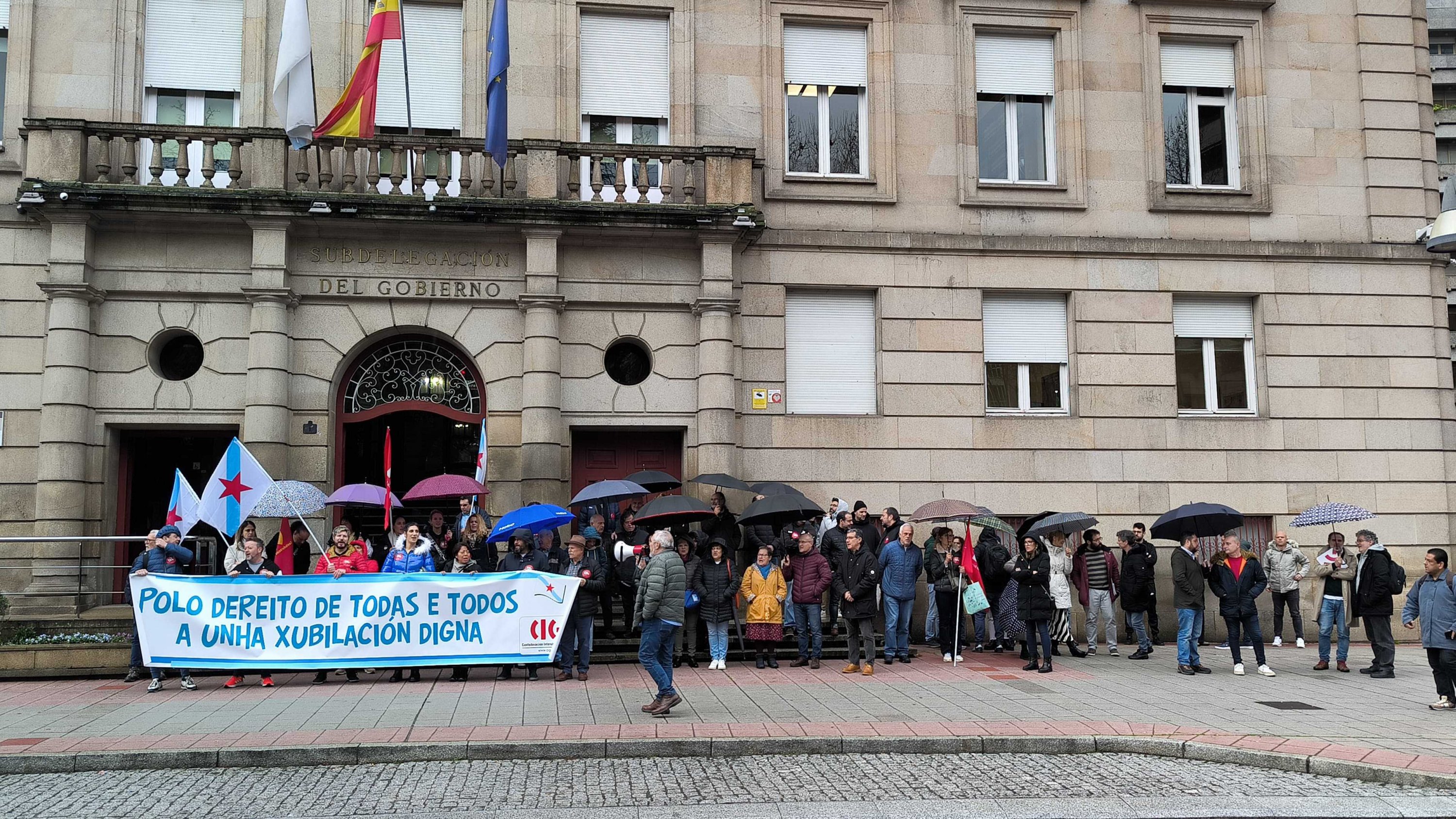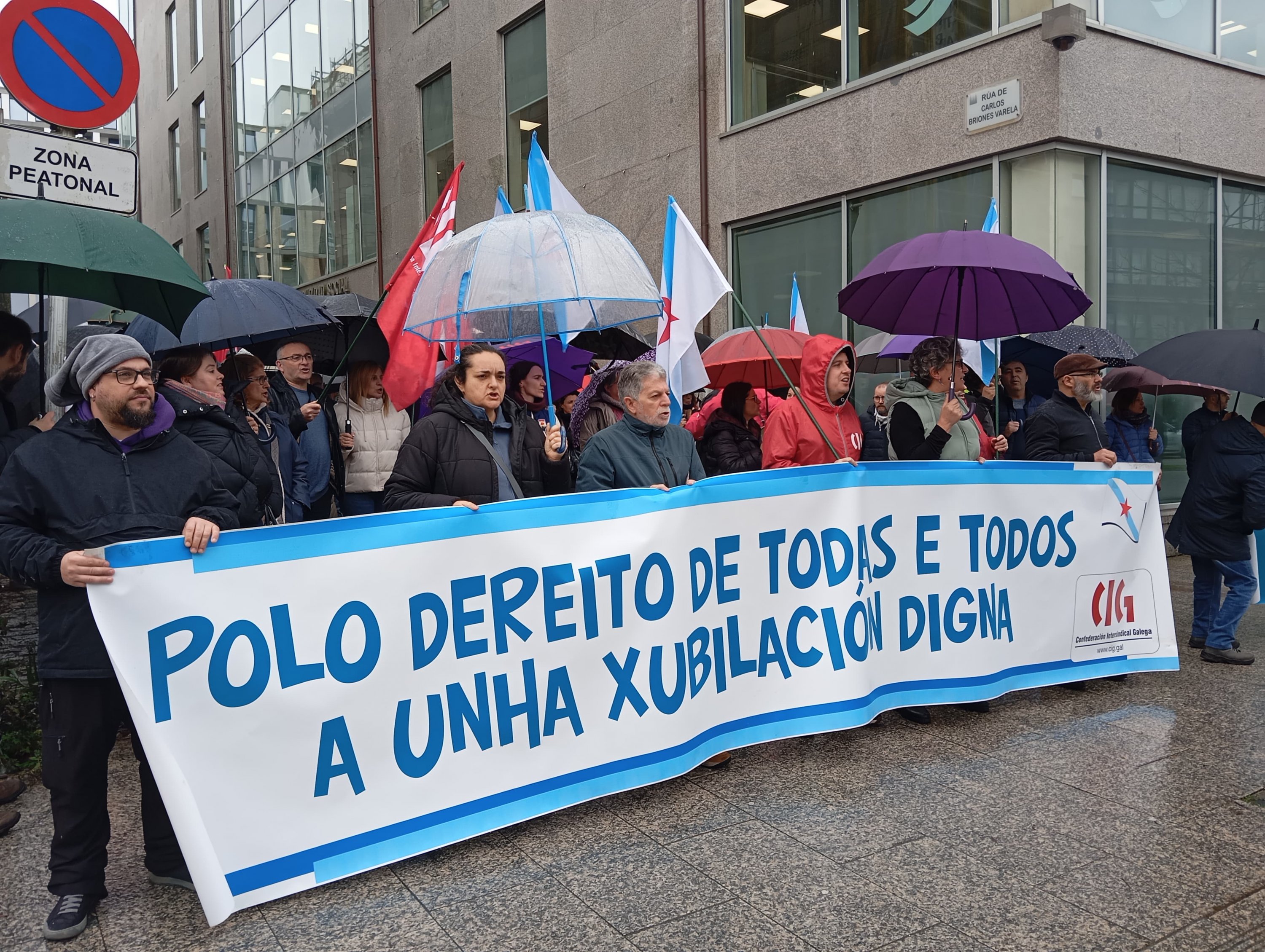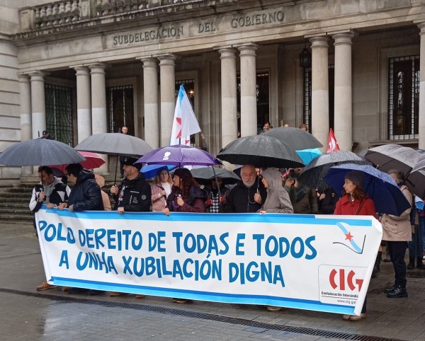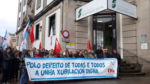 Delegadas e delegados da CIG concentráronse esta mañá diante da Delegación do Goberno, na Coruña; das subdelegacións do Goberno en Lugo, Ourense e Pontevedra, e nas oficinas do INSS, en Compostela, Ferrol e Vigo, para denunciar o novo recorte na xubilación parcial, que suporá outro retroceso de dereitos máis para a clase traballadora. A mobilización coincidiu coa convalidación, no Congreso das e dos Deputados do Decreto de xubilación parcial.
