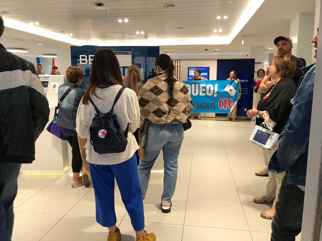 Delegados e delegadas da CIG participaron este mércores en accións simultáneas en varias entidades bancarias do país para denunciar o banquete de beneficios que a ten a gran banca a conta, entre outras, da inxusta suba dos tipos de interese, mentres a persoas traballadoras perciben salarios de miseria, se estende a pobreza, aumenta o número de persoas sen fogar e cada día máis familias teñen problemas para poder afrontar o pago da hipoteca e dos prezos dos produtos de primeira necesidade.