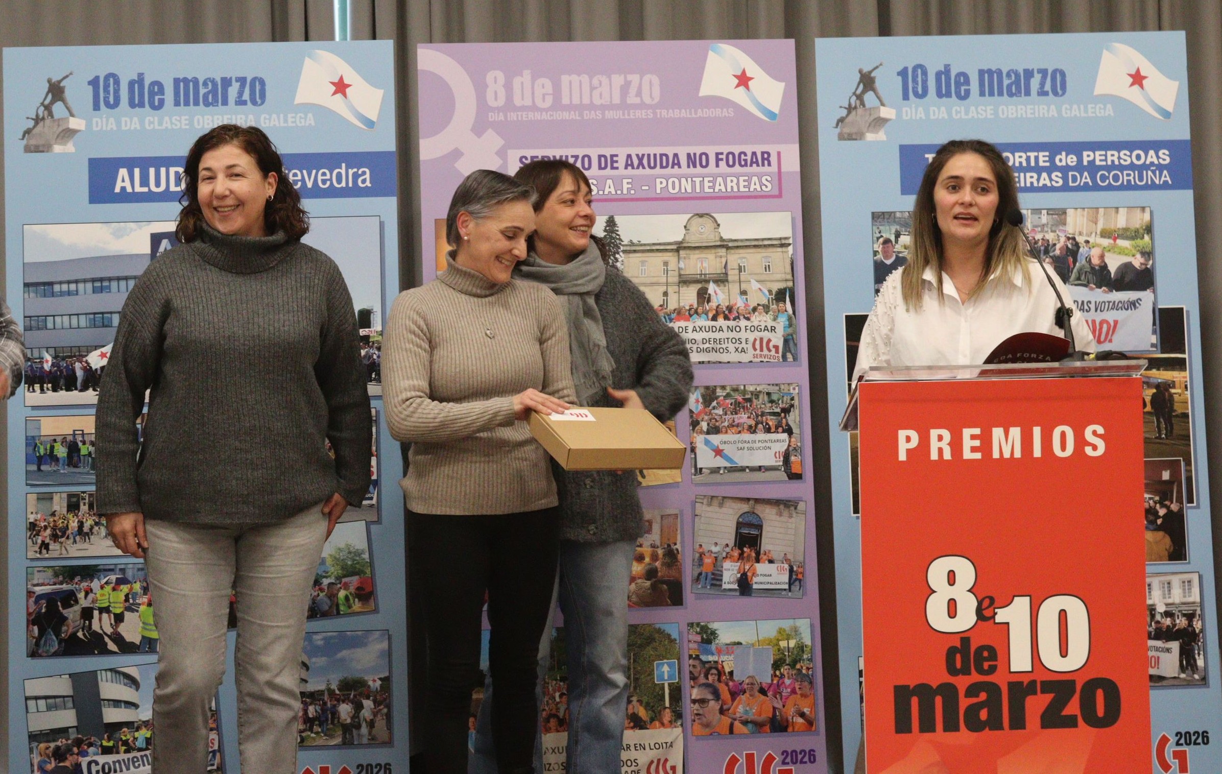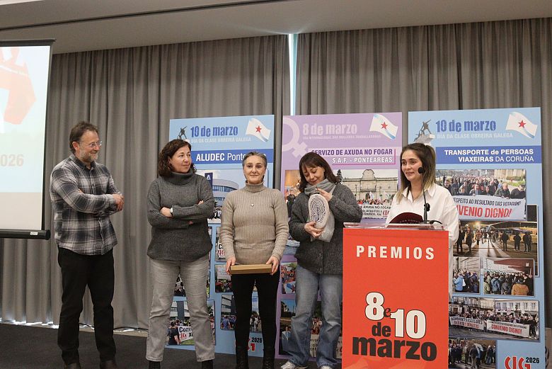 A CIG recoñeceu este venres co ‘Premio 10 de Marzo’ a loita do persoal do transporte de viaxeiros/as da Coruña na demanda dun convenio colectivo xusto, pola súa dignidade e para exixir respecto pola súa vontade. Un conflito duro, pero que demostrou a capacidade de mobilización, organización e resistencia deste sector fronte a unha patronal que primeiro secuestrou a negociación colectiva e despois non dubidou en recorrer a todo tipo de manobras para impoñer un acordo que o persoal rexeitou con absoluta contundencia. No acto deste venres, decorrido en Compostela, fíxose tamén unha mención especial á loita do persoal de Aludec Pontevedra en contra da precariedade laboral e para esixir convenios colectivos xustos.