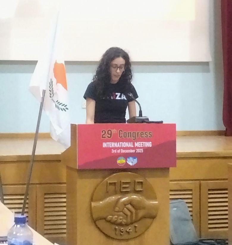 No caso concreto da illa chipriota, lembrouse que 37% do territorio permanece ocupado polo goberno turco e que fica instalada na illa a maior extensión de bases militares británicas empregadas pola OTAN. A organización sindical PEO reafirmou os seus esforzos xunto con organizacións da parte ocupada pola reunificación do territorio e da poboación para avanzar no proceso de unidade encamiñado so a loita por un futuro de paz e xustiza social.