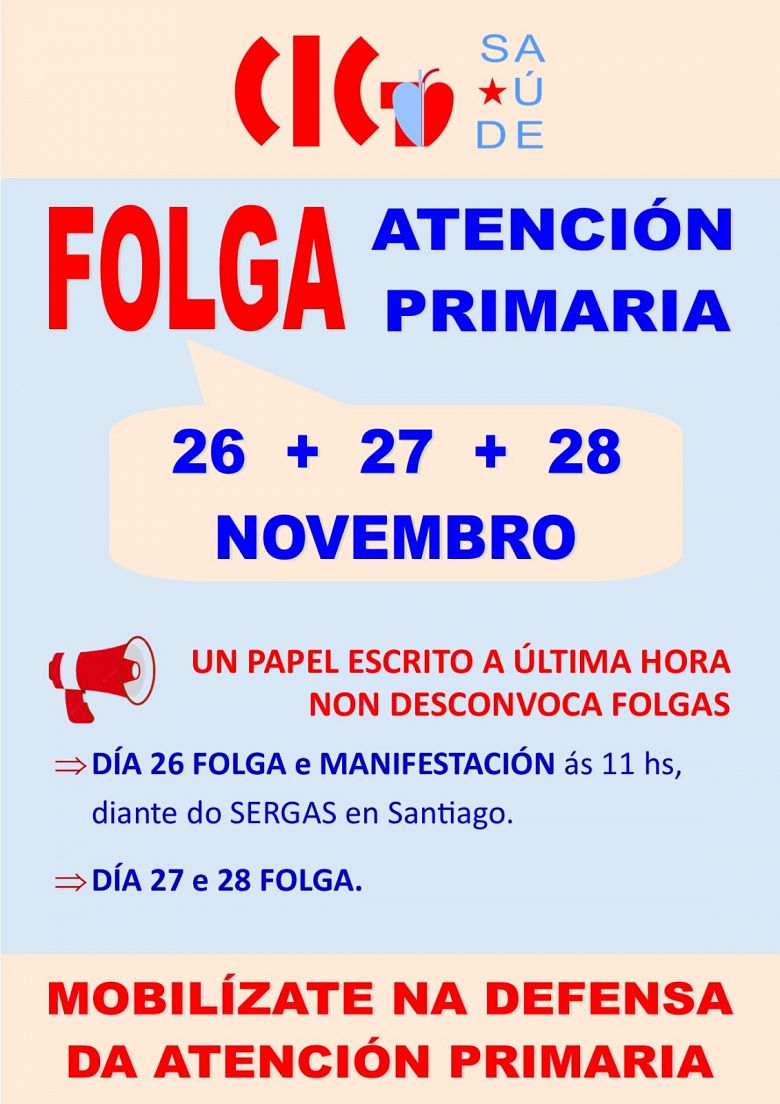 A CIG-Saúde mantén a folga na Atención Primaria para os días 26, 27 e 28 de novembro