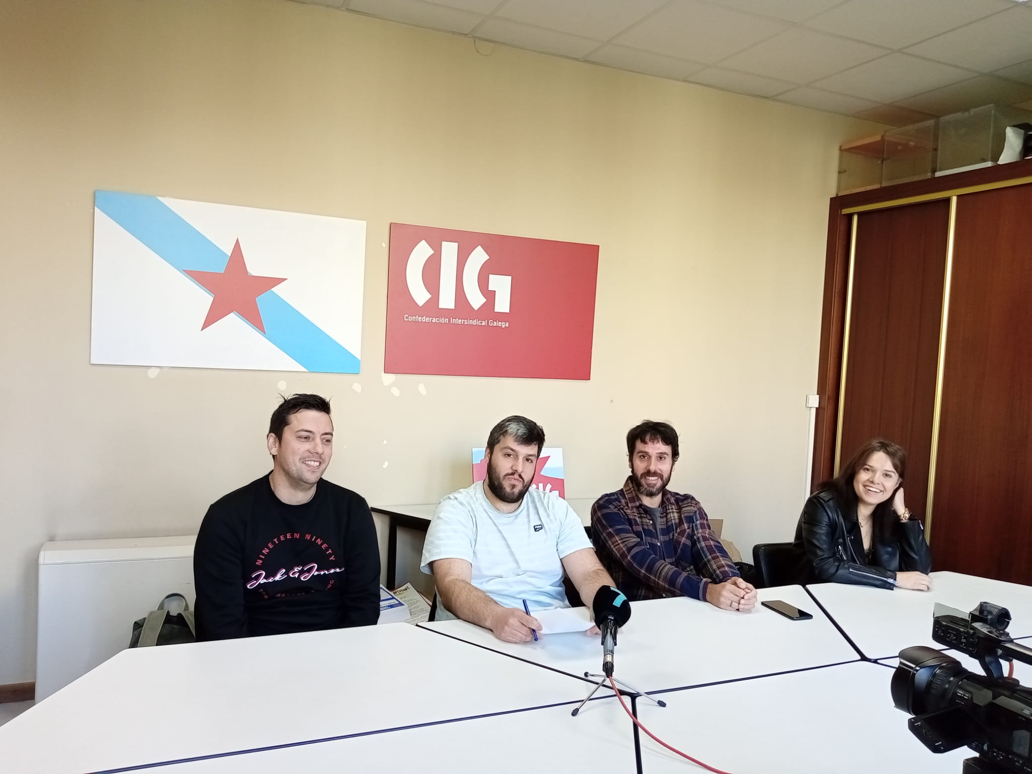 O secretario comarcal da comarcal da CIG-Servizos de Pontevedra, Iván Veiga, compareceu en rolda de prensa xunta a Aitor Maquieira, da CIG-Servizos, e delegados/as da central no sector para denunciar a actitude da patronal, “xa que despois de catro xuntanzas non sacamos nada en limpo”.
