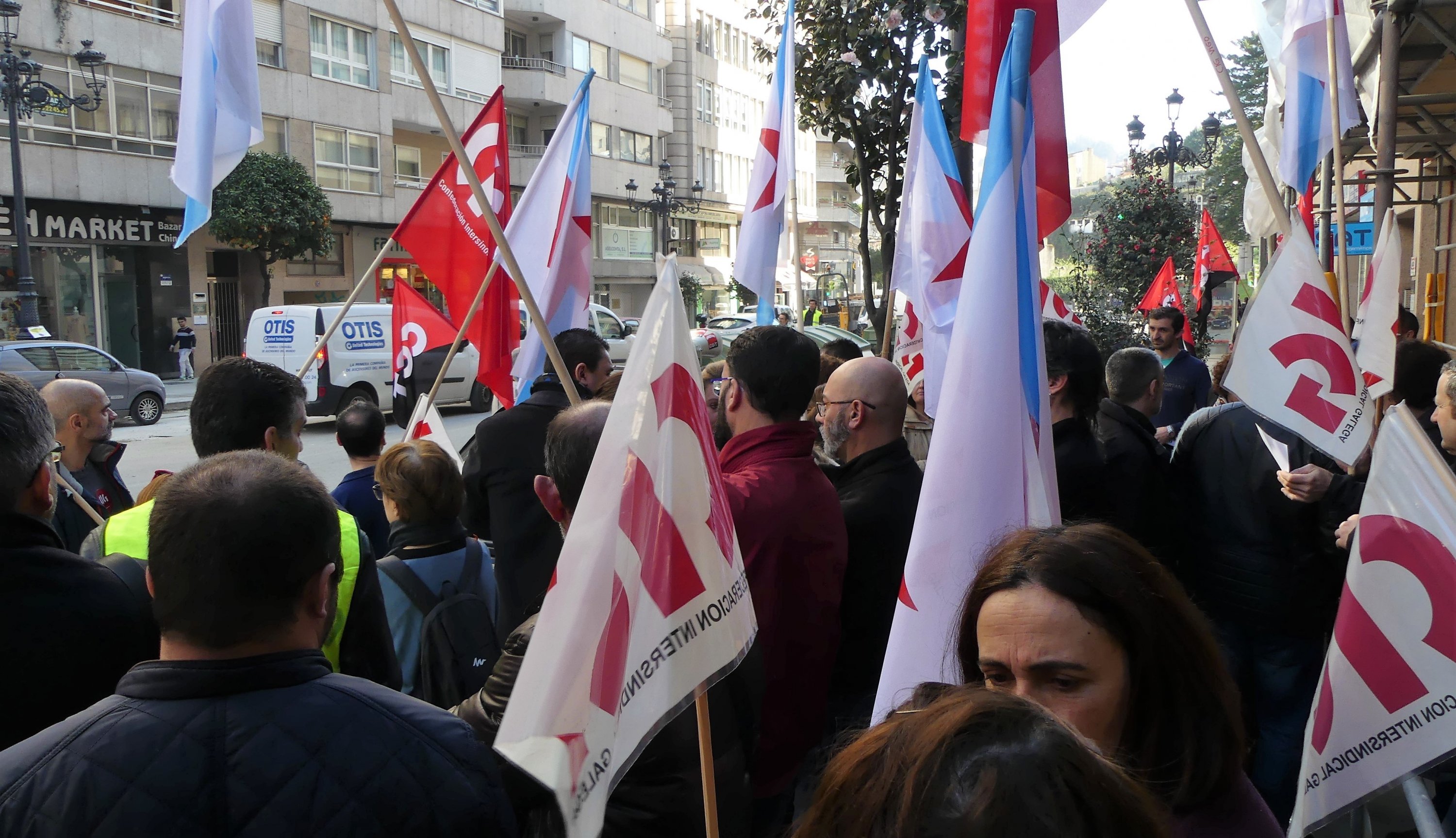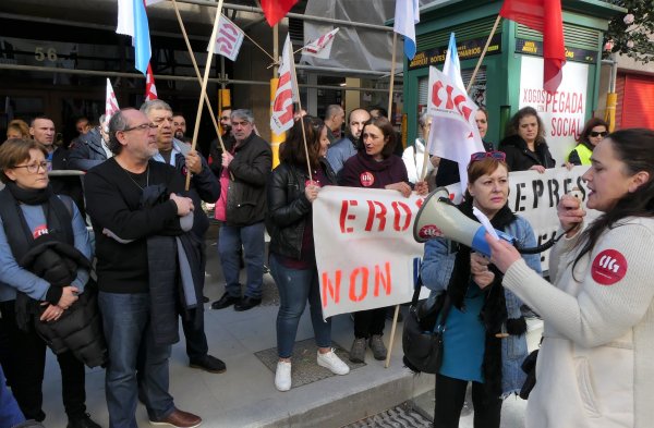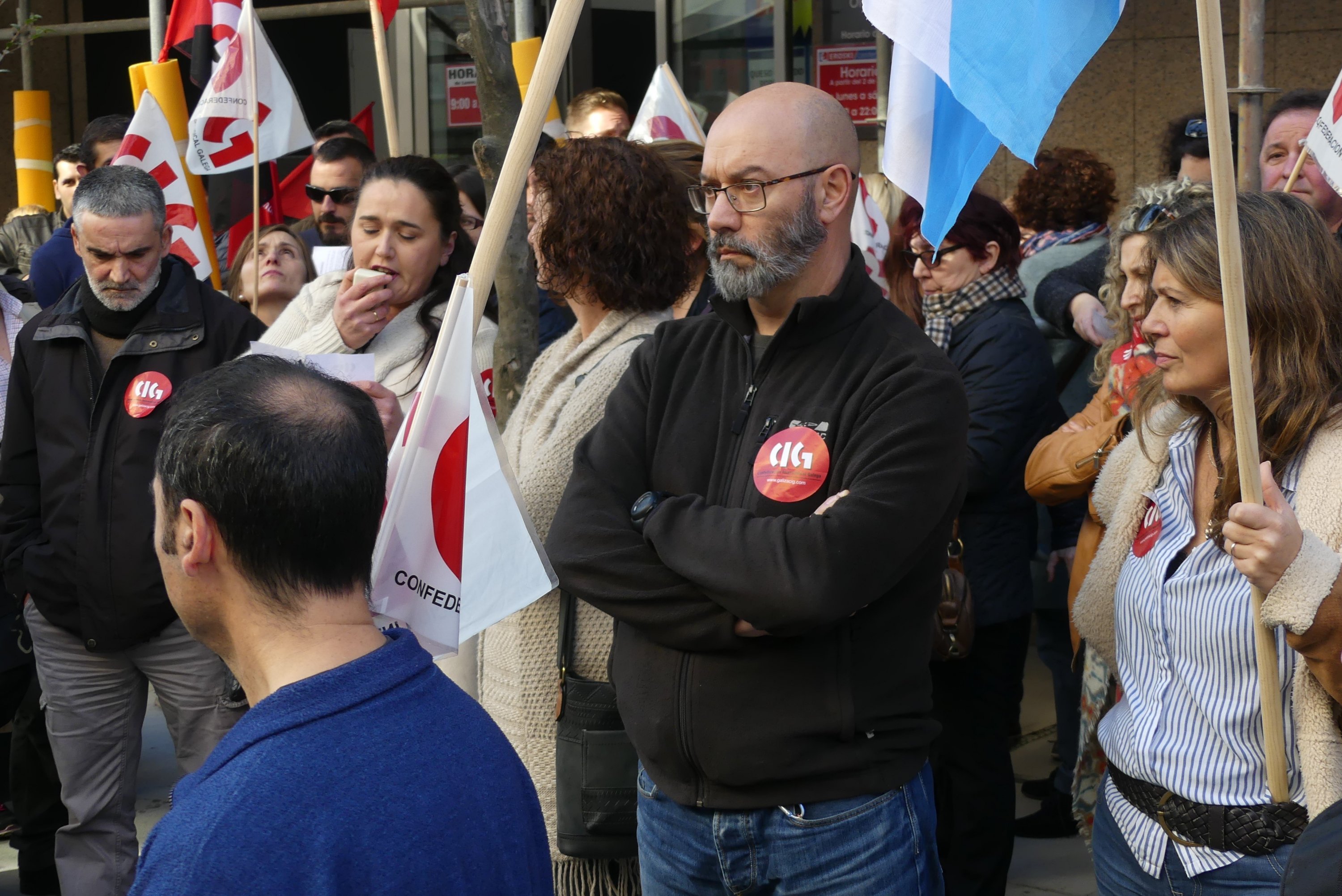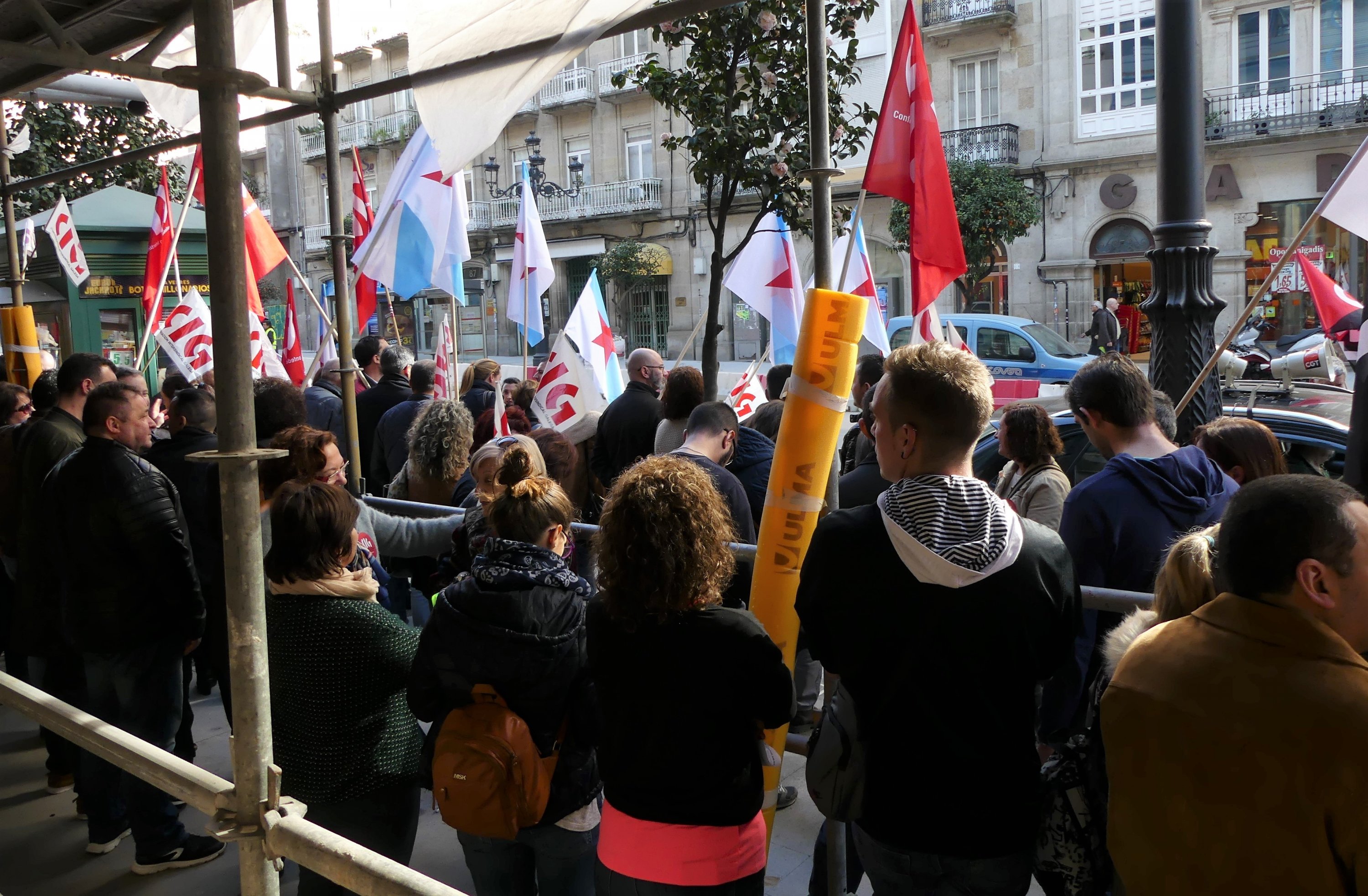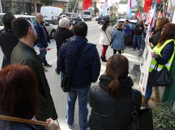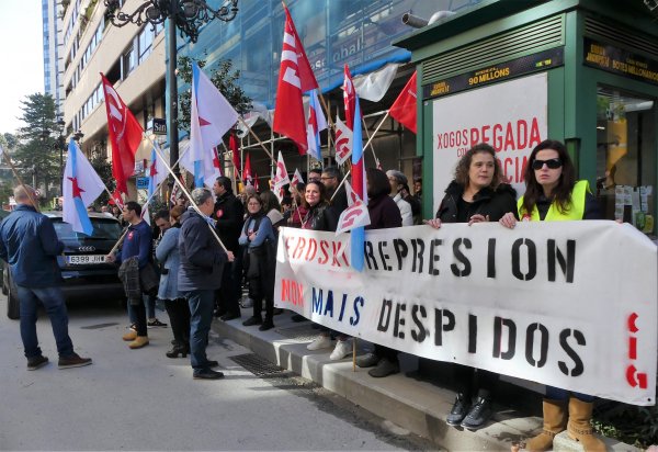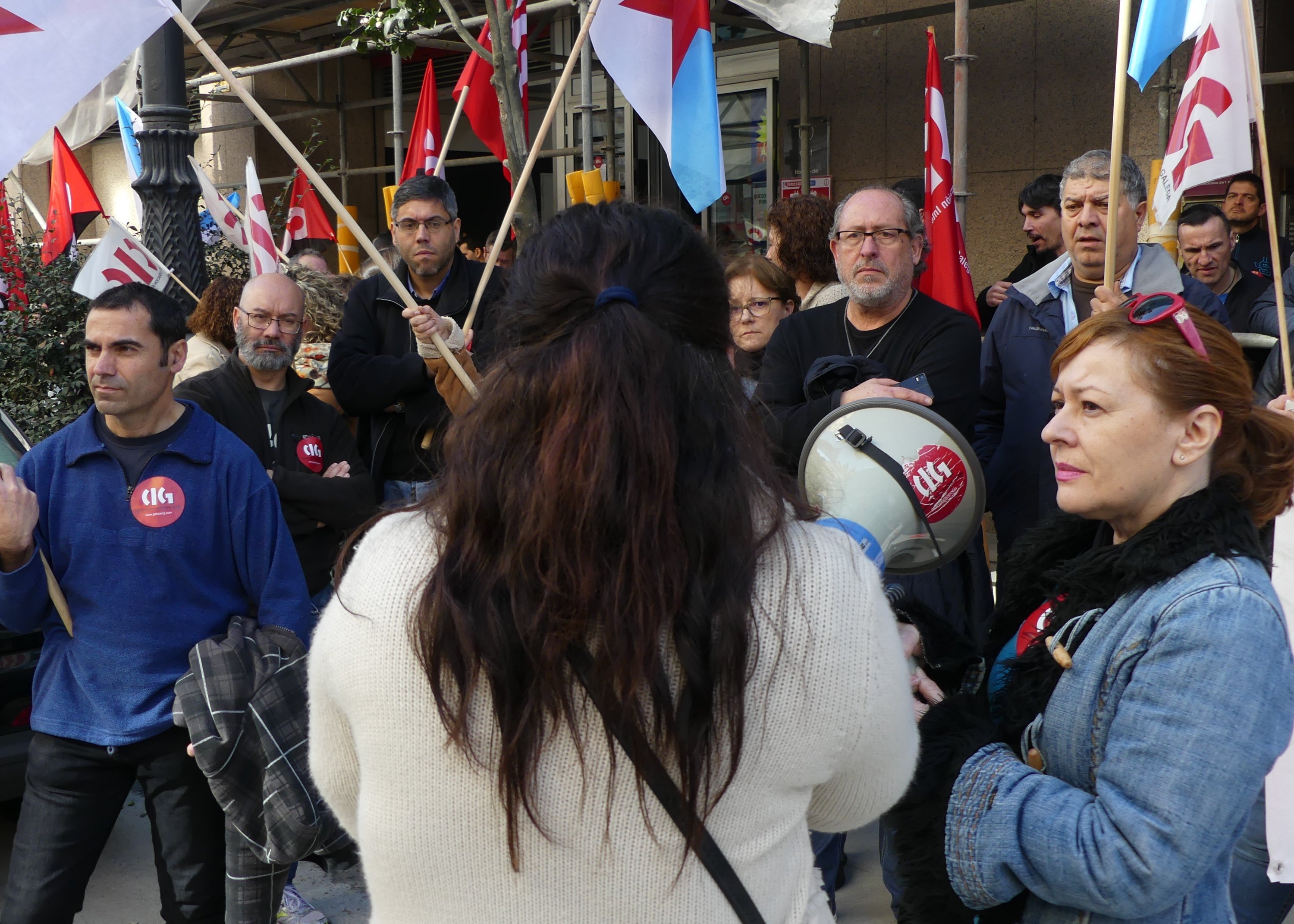 Traballadores/as de Eroski e delegados/as da CIG-Servizos levaron a cabo este mediodía unha concentración dunha hora diante do supermercado da rúa García Barbón 54 para amosar a súa oposición ao despedimento de tres compañeiros/as que tiñan contrato indefinido e que contaban con antigüidade na empresa.