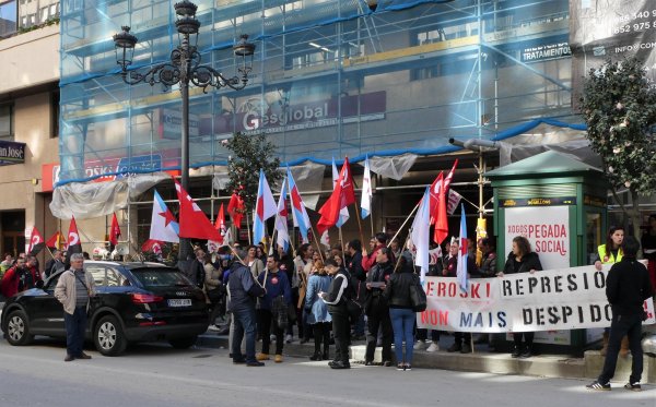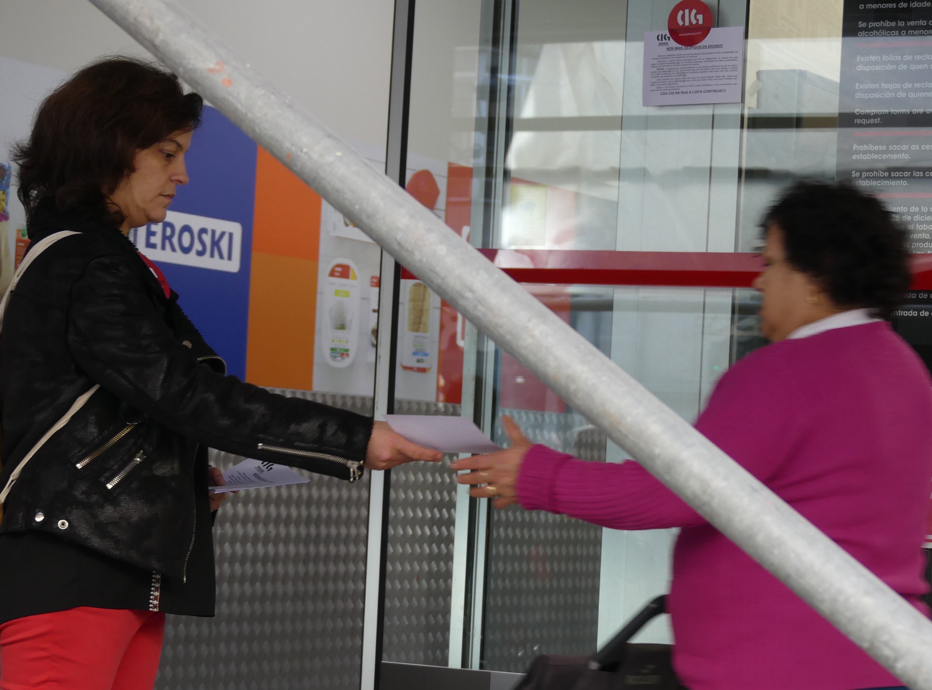 Deste xeito, entre as 12.00 e as 13.00 horas permaneceron ás portas do establecemento -onde despregaron unha faixa na que se podía ler “Eroski represión. Non máis despidos”- berrando consignas como “Despedidos/as readmisión”, “Eroski precariza o emprego na Galiza” ou “Non á represión”.