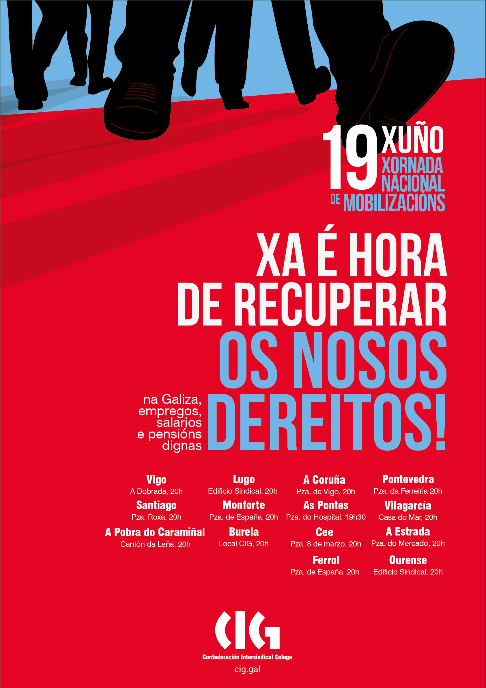 Por todo isto chamou á xornada nacional de mobilizacións para o vindeiro día 19 de xuño en todas as comarcas para exixir “un cambio inmediato de políticas” entre as que salientou a derrogación das reformas laborais “que nos empobrecen”; conseguir avances reais para as mulleres; defender as pensións públicas; rematar cos abusos da patronal; frear as políticas de recorte contra a xente desempregada; acabar coa privatización de servizos públicos; impedir o retroceso nas liberdades e dereitos fundamentais e conquistar o dereito a vivir e traballar dignamente na nosa terra.
