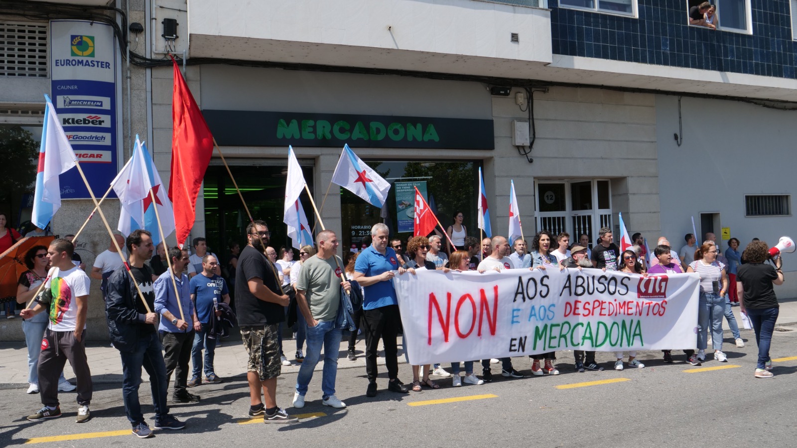 A CIG-Servizos trasladou este xoves a Ourense as mobilizacións para rexeitar os despidos e a represión laboral e sindical en Mercadona, tras a protesta que tivo lugar en Verín o pasado 18 de maio. Un grupo de traballadoras/es e de delegadas/os desenvolveu unha concentración ao mediodía ás portas do establecemento das Lagoas despois de que a empresa lle comunicase á cabeza de lista da central nas eleccións sindicais que a cambia de centro de traballo tras 17 anos no mesmo.
