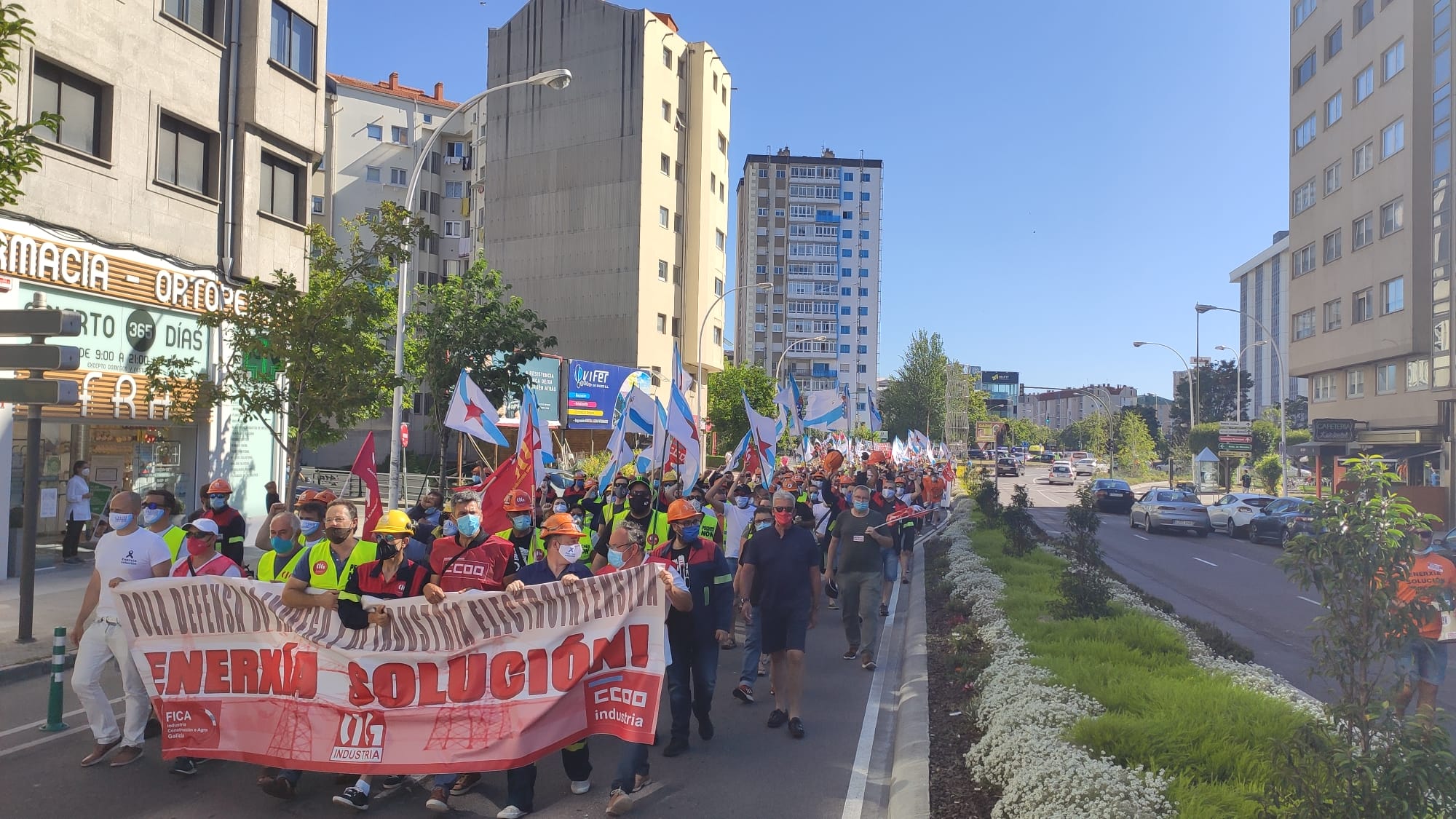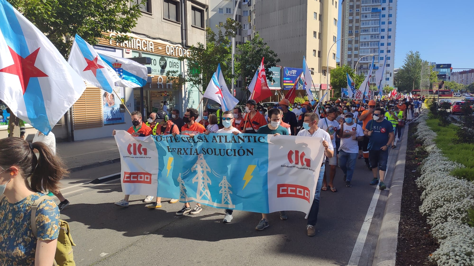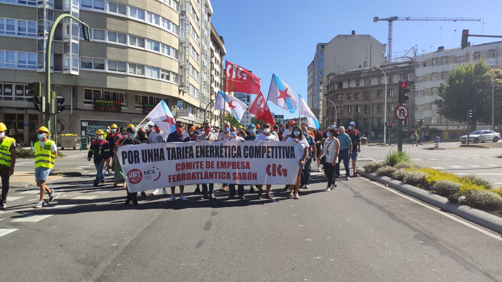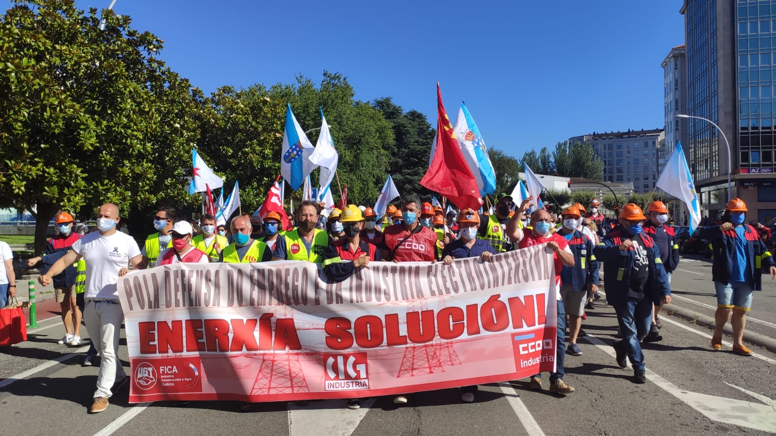 Baixo o lema "Pola defensa do emprego e da industria electrointensiva. Enerxía Solución", traballadores e traballadoras das industrias con grandes consumos eléctricos e centos de persoas manifestáronse esta tarde na Coruña dende o edificio administrativo da Xunta até a Delegación do Goberno. A marcha (convocada por CIG, UGT e CCOO) dá continuidade ás mobilizacións que xa se viñan realizando no sector antes da crise sanitaria, pola ausencia dunha regulación enerxética adecuada para a industria electrointensiva que pon en risco permanente a continuidade de milleiros de postos de traballo directos, e que representa unha ameza para toda a economía das comarcas onde está asentada.