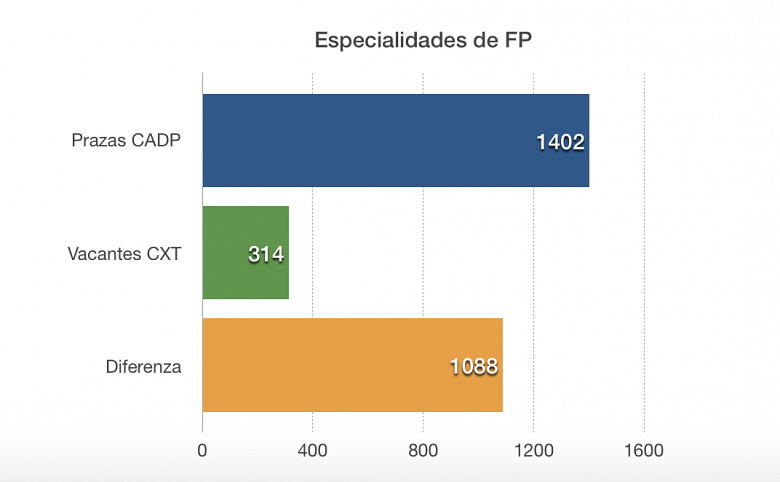 En especialidades propias da FP, vemos como FOL, presente en todos os ciclos formativos e, por tanto, en todos os centros, conta con 8 vacantes fronte a 78 destinos provisionais. Os desfases tamén están presentes en Administración de Empresas (8 de 68), Informática (5 de 60), Procesos de Produción Agraria (1 de 15), Procesos Sanitarios (9 de 28), Sistemas Electrónicos (2 de 27), Cociña e Pastelaría (1 de 25) e un longo etcétera que practicamente lle afecta á totalidade de especialidades.