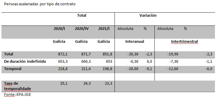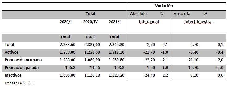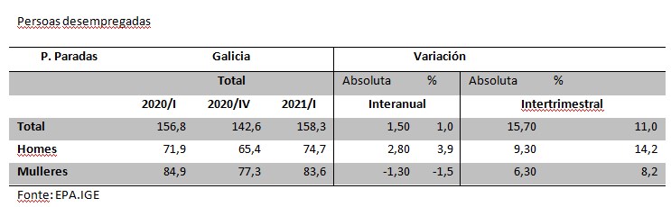 Os datos da EPA do I Trimestre de 2021 amosan unha estampa demoledora sobre a situación laboral en Galiza, cun empeoramento xeneralizado de todas as variables do mercado laboral. A taxa de paro increméntase até o 13%, 1,3 puntos porcentuais máis que respecto do último trimestre do ano 2020, con 158.300 persoas desempregadas, 15.700 máis que no trimestre anterior. E xunto a isto descende a taxa de ocupación e actividade.