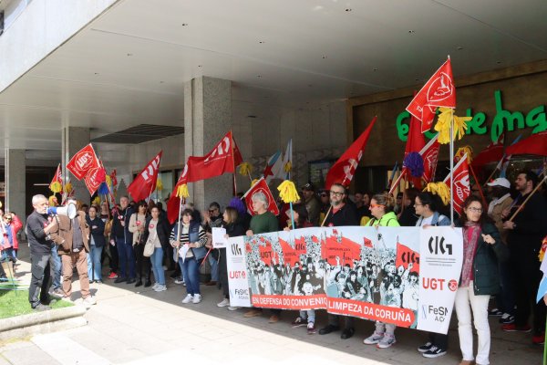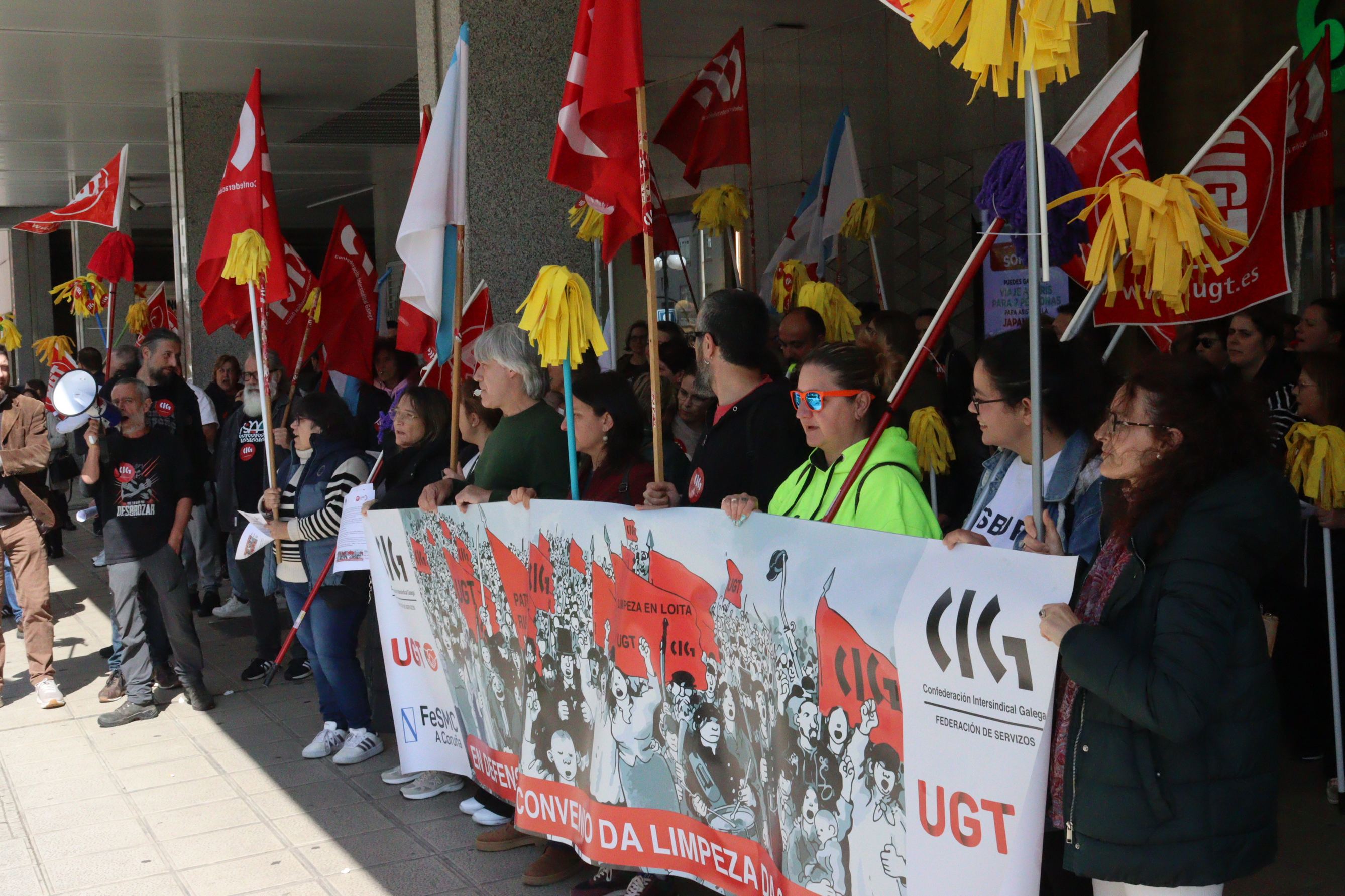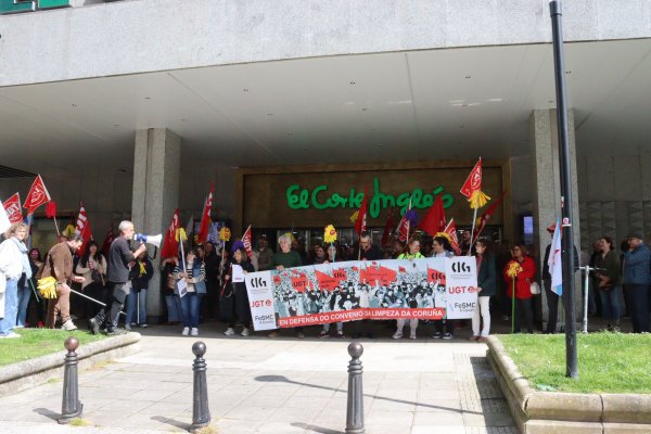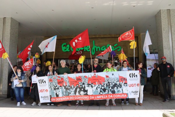 Pola súa banda, as traballadoras da limpeza da Coruña concentráronse esta tarde diante do Corte Inglés de Catro Camiños para reclamar un convenio digno no sector e a actualización salarial do 9,8%, pendente dende xaneiro deste ano. A escolla do lugar débese a que o centro comercial ten contratados os servizos de limpeza con Eulen, unha das principais empresas que integran a patronal estatal ASPEL.