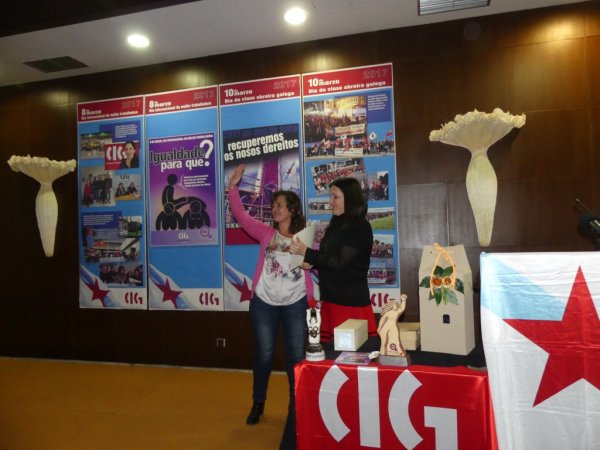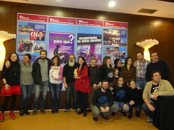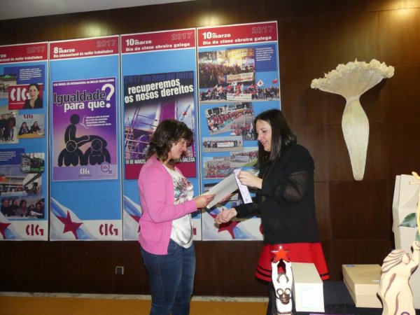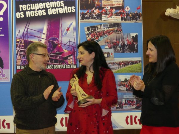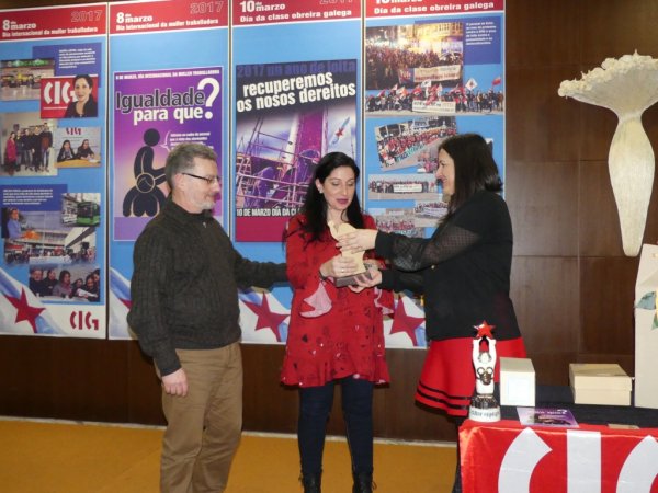 O acto de entrega dos premios comezou coa emotiva lembranza á compañeira Elvira Patiño e coa entrega, por parte de Suso Seixo, dunha figura de Julia Ares á súa familia como mención especial e recoñecemento da central sindical a toda unha vida de compromiso.