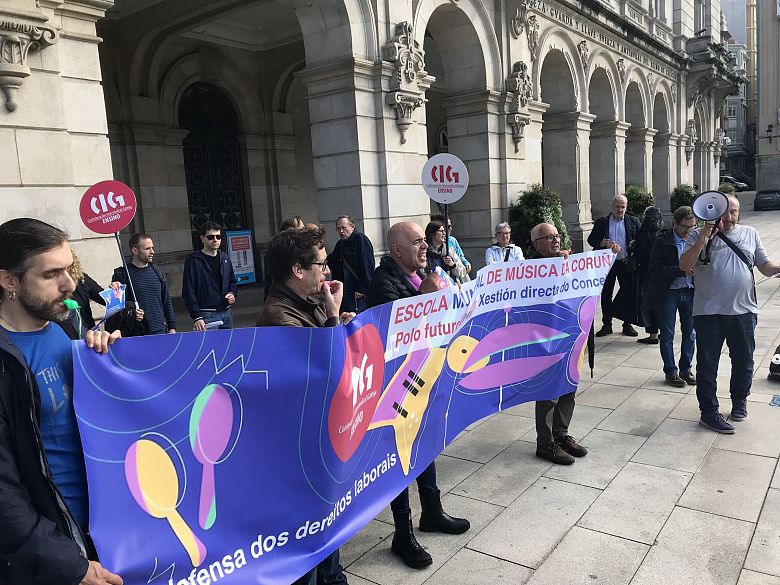 "Seguimos a reclamar a municipalización", aseverou durante a concentración a delegada de persoal da CIG, Matilde Teijeiro, quen lembrou que aínda que a escola se xestiona a través do Consorcio para a promoción da música "é do Concello e todo o persoal xa pasou por un proceso de estabilización".