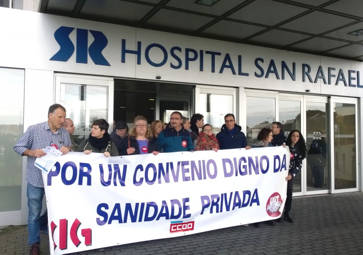 As organizacións sindicais CIG, UGT e CCOO retomaron esta semana as mobilizacións contra o bloqueo patronal na negociación do convenio colectivo da sanidade privada da Coruña, cunha protesta no Hospital San Rafael, no se realizou tamén un reparto de folletos para informar do conflito ás usuarias e usuarios deste centro.