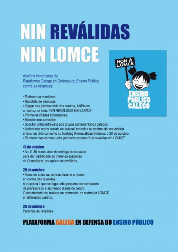 Ademais pedirase aos centros que penduren en lugares visíbeis pancartas co lema “Nin reválidas nin LOMCE”.