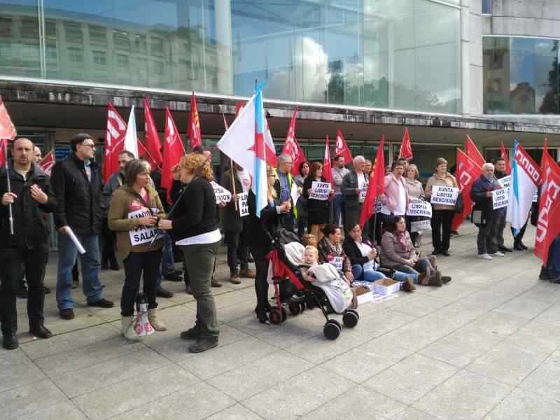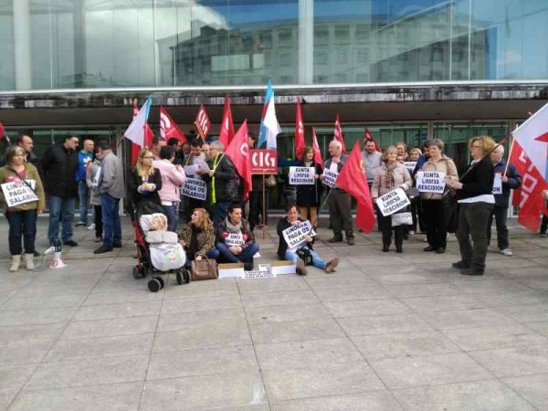 As traballadoras e traballadores tamén desenvolveron unha concentración ás portas dos edificios da Xunta en Lugo ao berro de “se non cobramos, tampouco limpamos”.