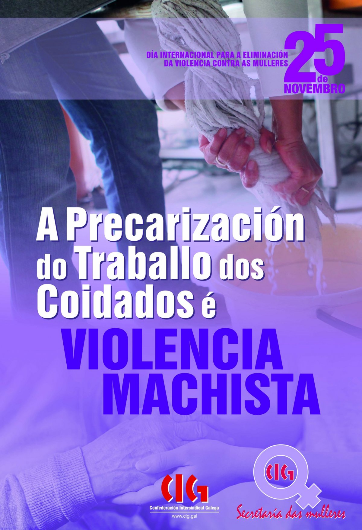 A secretaría das Mulleres da CIG conmemora este 25 de Novembro, Día Internacional para a Eliminación da Violencia Contra as Mulleres, cunha campaña baixo o lema “A precarización do traballo nos coidados é violencia machista”, para denunciar a explotación que está detrás de todas as actividades relacionadas cos coidados, a súa minusvaloración e a cada vez maior precarización.