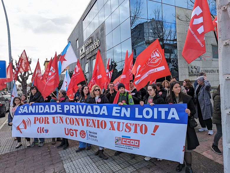 Traballadoras e traballadores da sanidade privada da Coruña continúan mobilizándose en demanda dun convenio colectivo digno e contra as pretensións da patronal de recortar dereitos, desta volta diante do Hospital HM Modelo da Coruña. A próxima concentración terá lugar o 11 de abril no Hospital A Rosaleda de Santiago e para os días 17, 18 e 19 de abril están convocadas novas xornadas de folga.