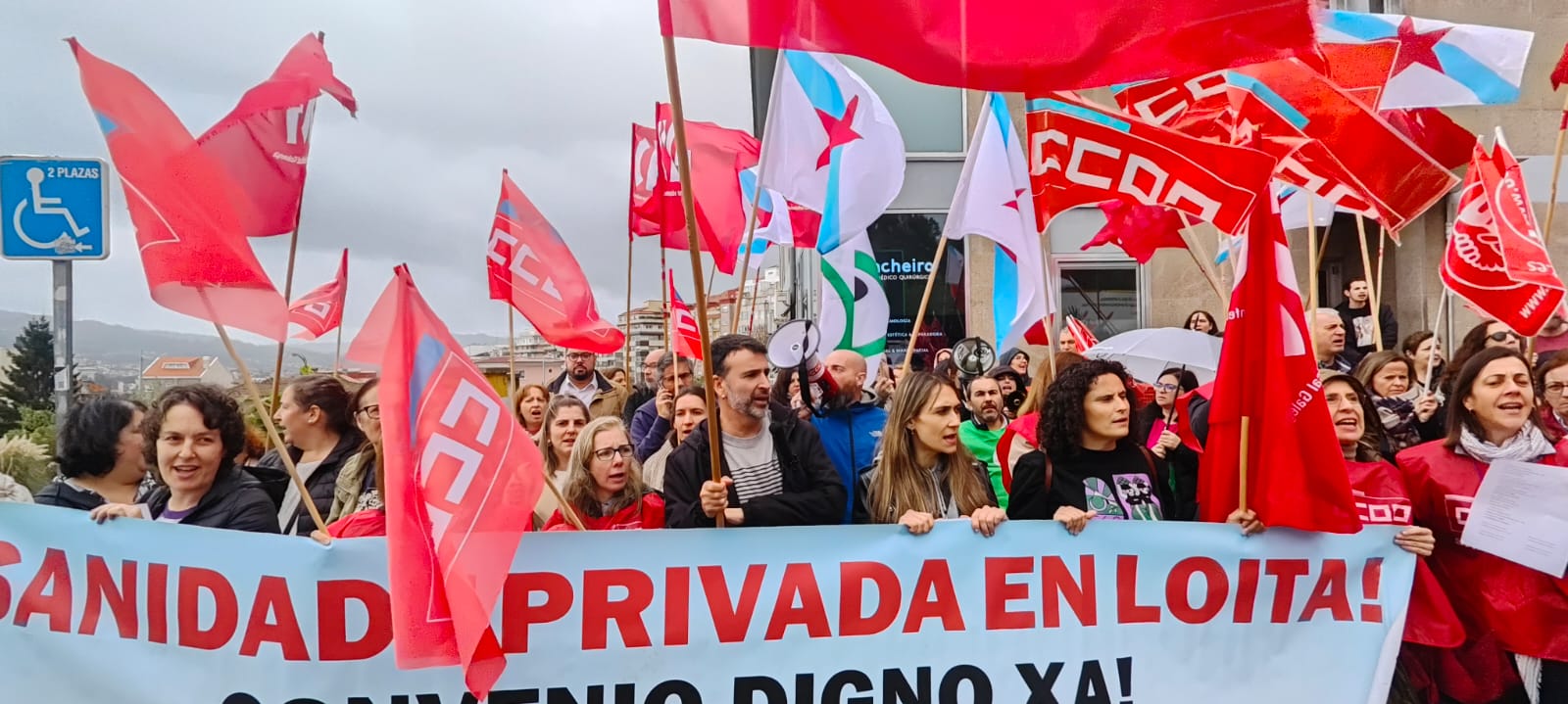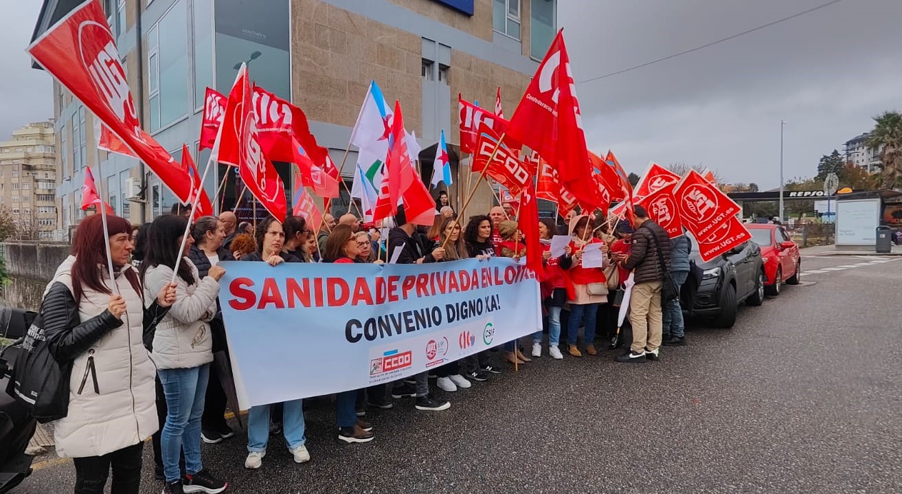 O persoal da sanidade privada da provincia de Pontevedra iniciou hoxe a súa loita para reclamar “un convenio colectivo digno xa” cunha concentración diante do centro médico Concheiro de Vigo. A patronal abandonou a última xuntanza da mesa de negociación como medida de presión para intentar que as protestas, que continuarán nas vindeiras semanas, non se fixesen efectivas.