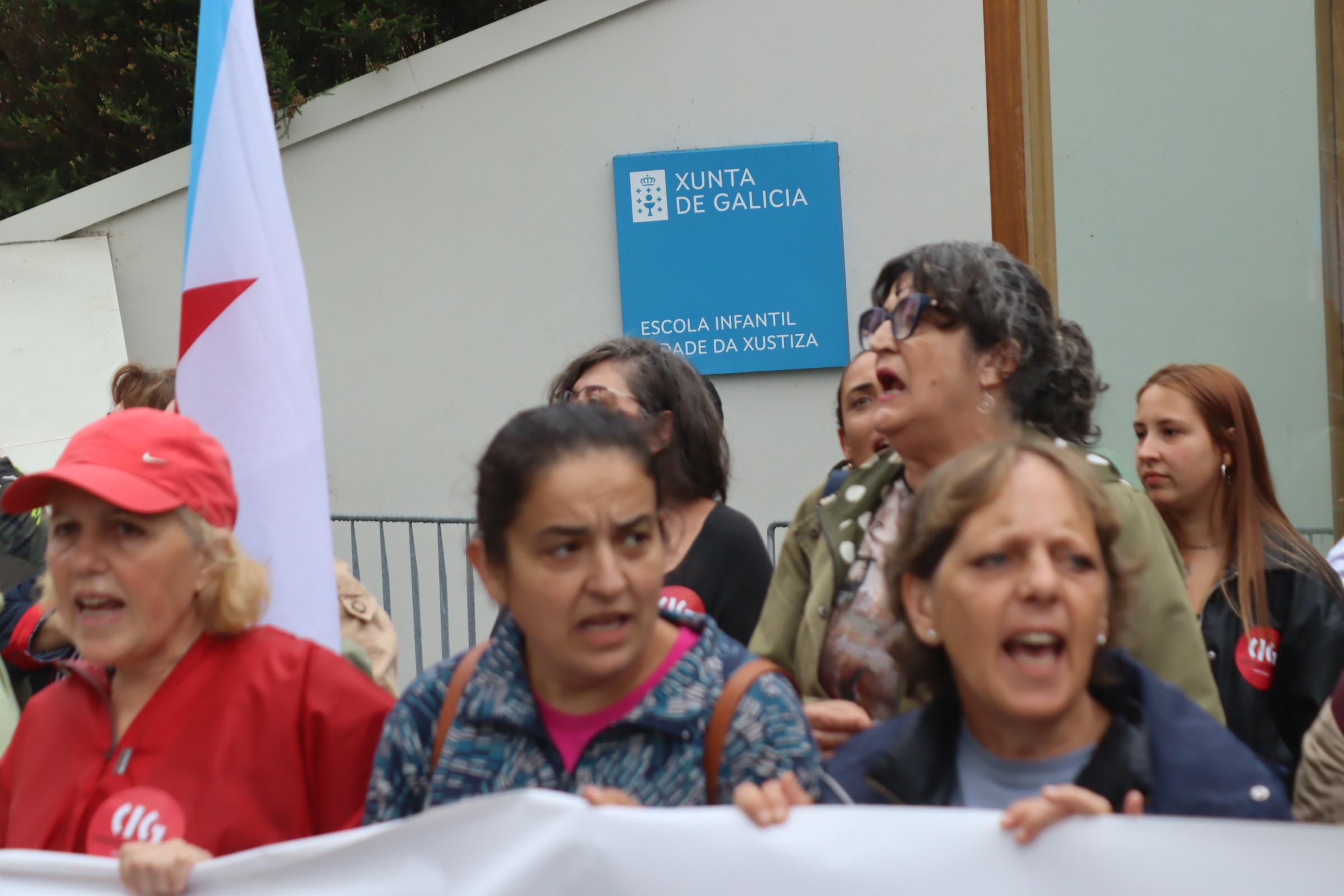 En Vigo, aproveitando a presenza da conselleira de Política Social, Fabiola García, as traballadoras trasladaron as súas protestas até a Cidade da Xustiza, onde a responsábel autonómica fixo unha visita á escola infantil. Porén, como vén sendo habitual, a conselleira evitou achegarse ás traballadoras para escoitar as súas demandas nin se interesou pola súa situación.