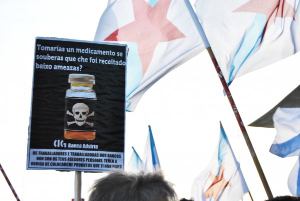 Trátase de traballadores/as a quen se lle triplican os obxectivos comerciais e se non colocan eses produtos que a cliente non demanda "arríscanse a un despedimento. Esa é a mensaxe que se nos está mandando: ou vendedes ou estades na rúa".