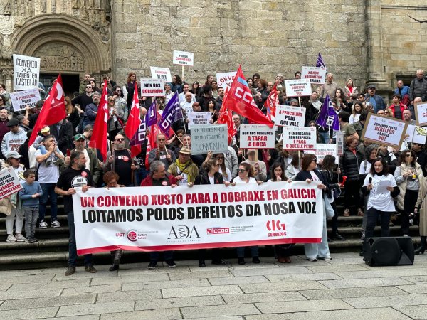 As e os profesionais da dobraxe en Galiza mobilizáronse este domingo polas rúas de Compostela convocadas polas Asociación de Artistas de Dobraxe, a CIG, CCOO e UGT e co apoio da Asociación galega de Actores e Actrices, para reclamar un convenio digno e denunciar, máis unha vez, a situación “insostible e ilegal” que soportan desde hai case dúas décadas.