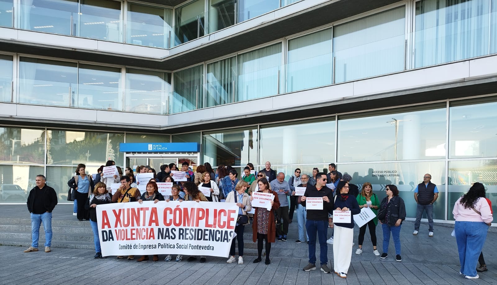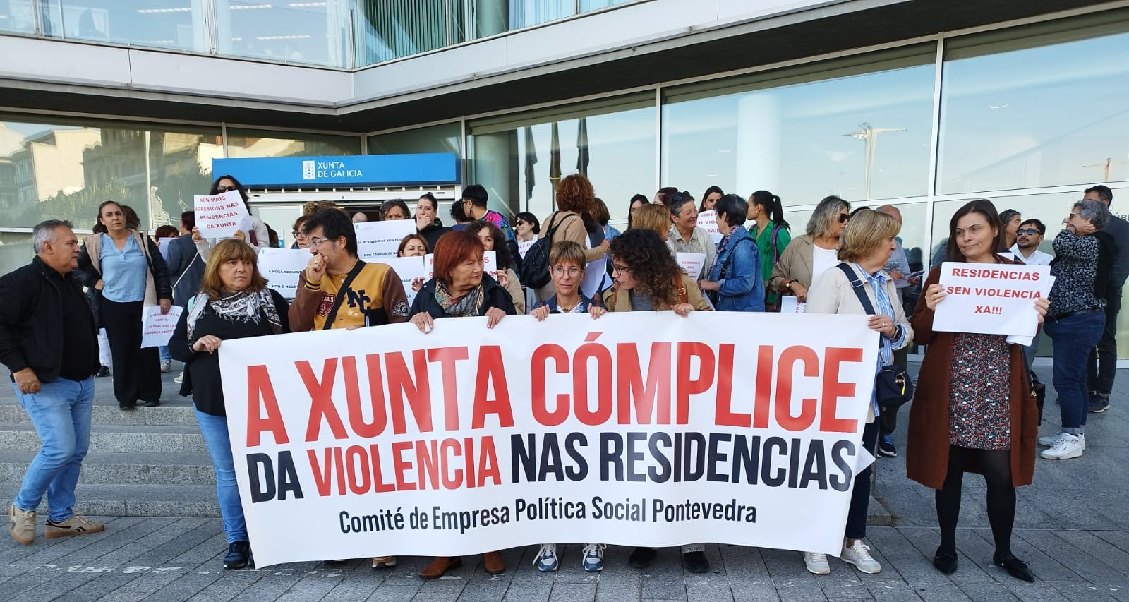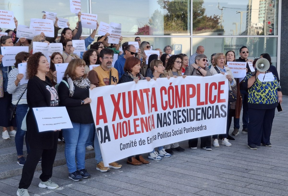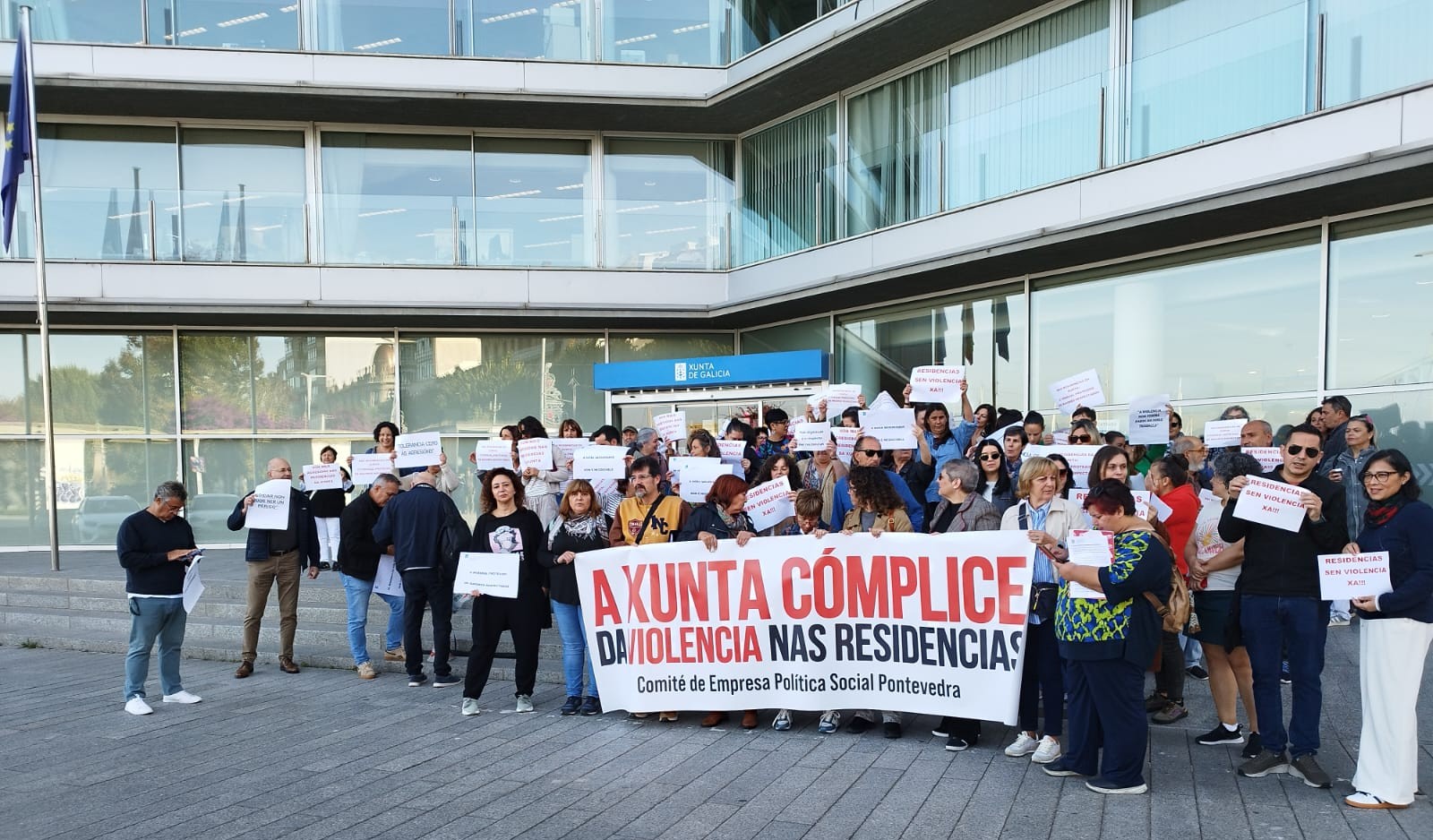 O comité de empresa do persoal laboral da Consellaría de Política Social na provincia de Pontevedra desenvolveu hoxe unha concentración diante da delegación da Xunta en Vigo para denunciar a complicidade da Administración autonómica coa maltrato que padecen a diario as persoas traballadoras e as usuarias das residencias de maiores públicas.