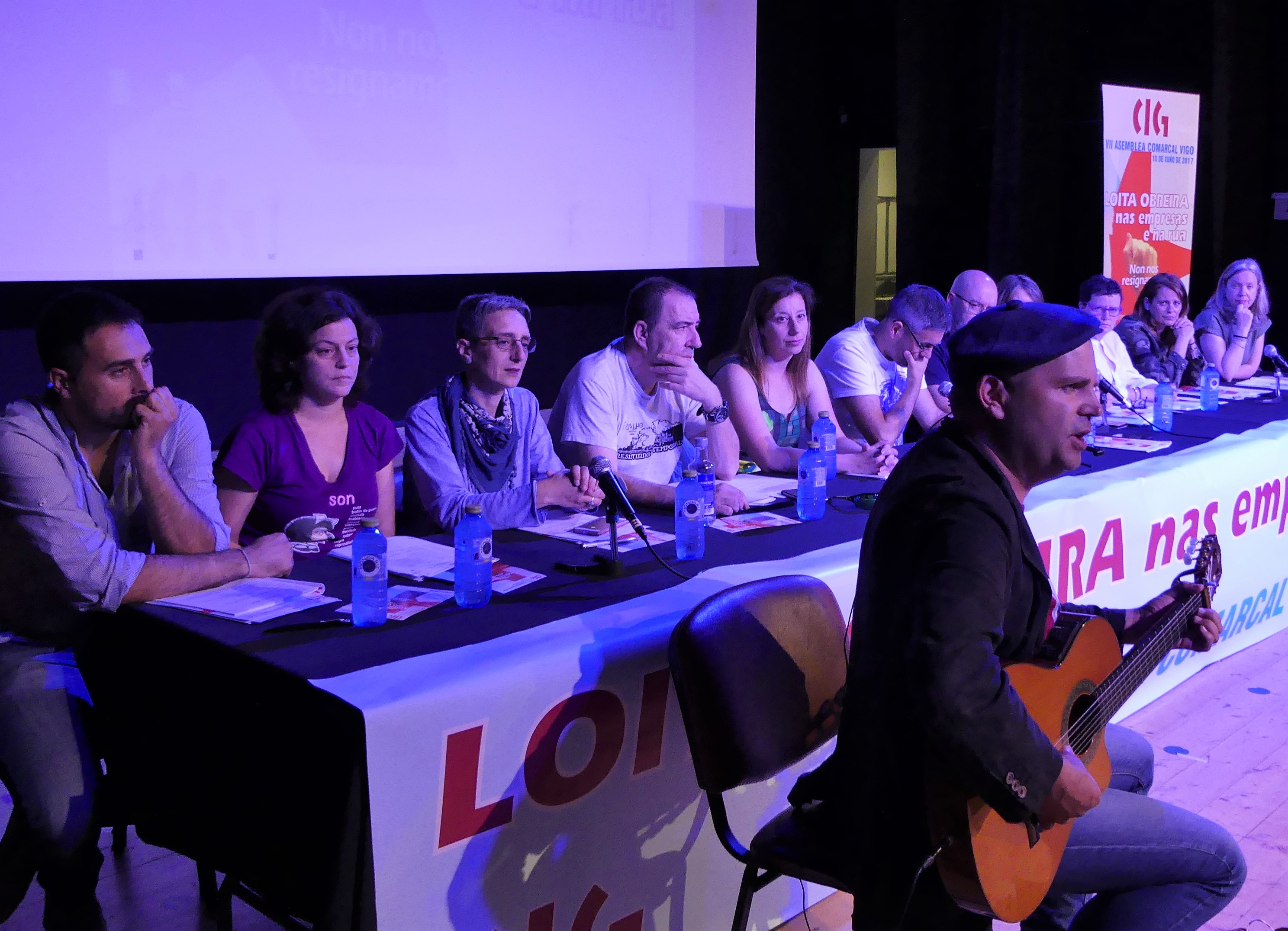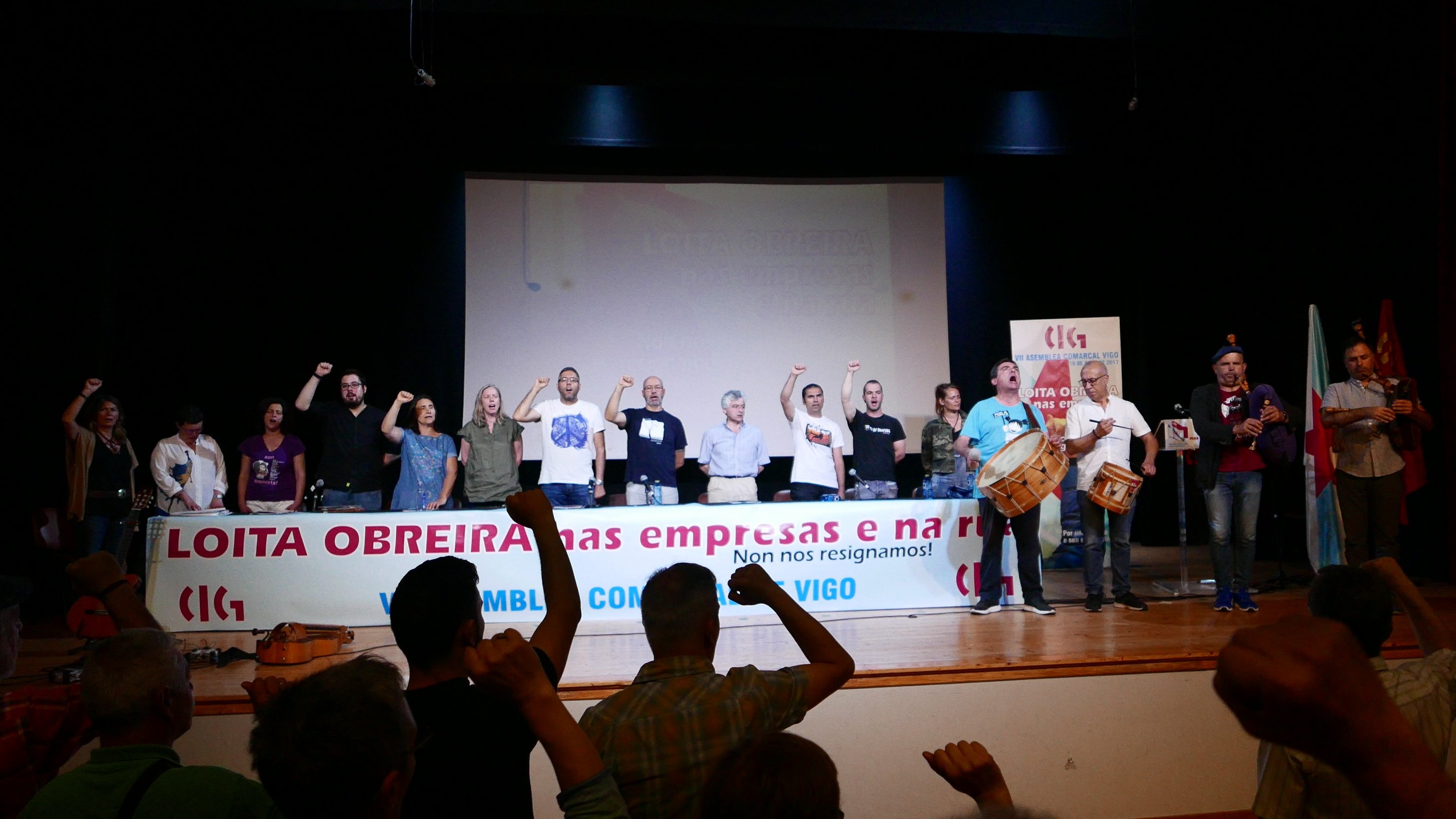 O proceso asambleario da CIG de Vigo pechouse coa interpretación do Himno galego, unha vez saudadas as delegacións convidadas -no caso da CGTP-IN o seu representante fixo unha breve intervención- e lidas as distintas resolucións. Ao inicio do acto cantouse a Internacional, e Tino Vaz foi o encargado da actuación musical, da que os asistentes puideron gozar até en dúas ocasións durante a Asemblea. Tamén se proxectou un traballo audiovisual no que se repasan os principais conflitos nos que a Unión Comarcal estivo presente nos últimos catro anos.