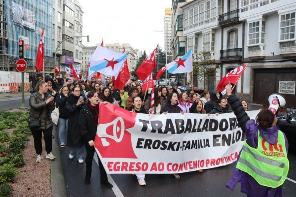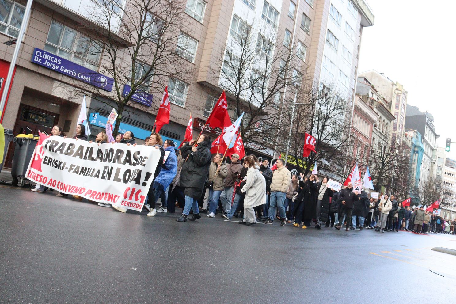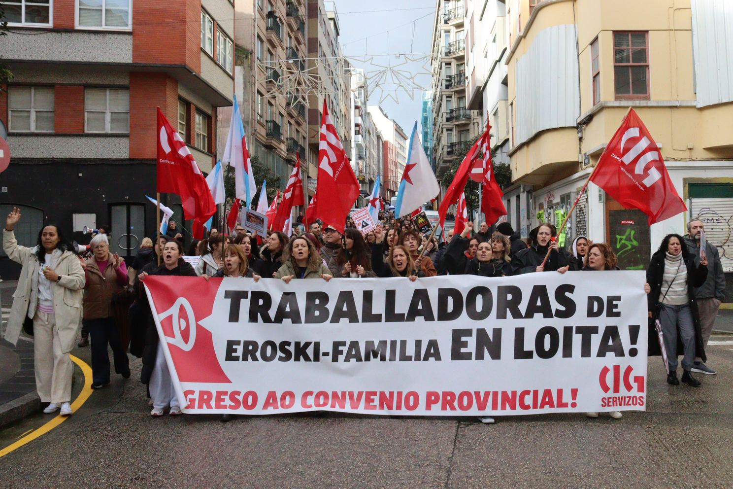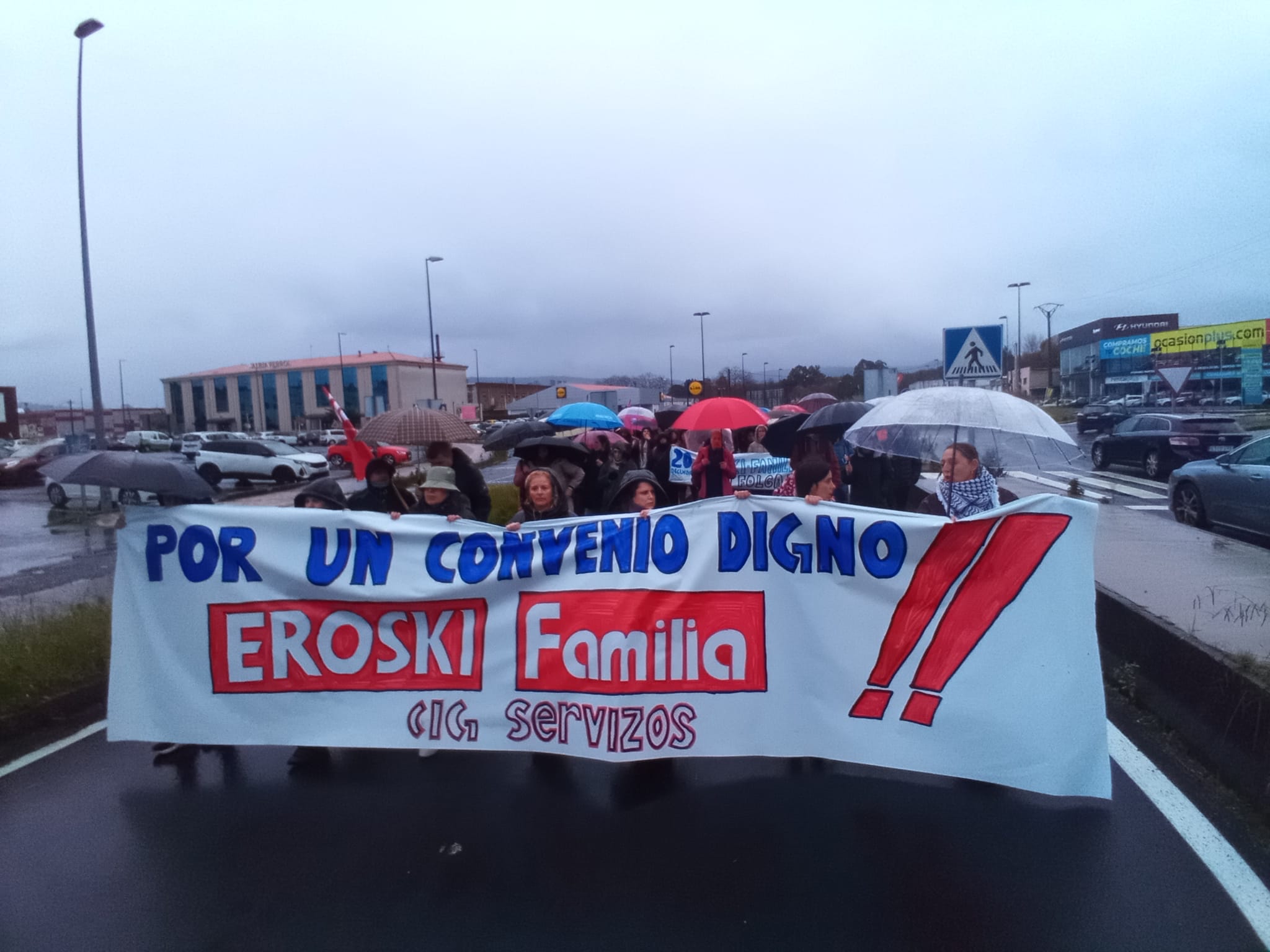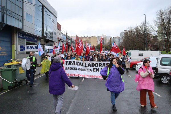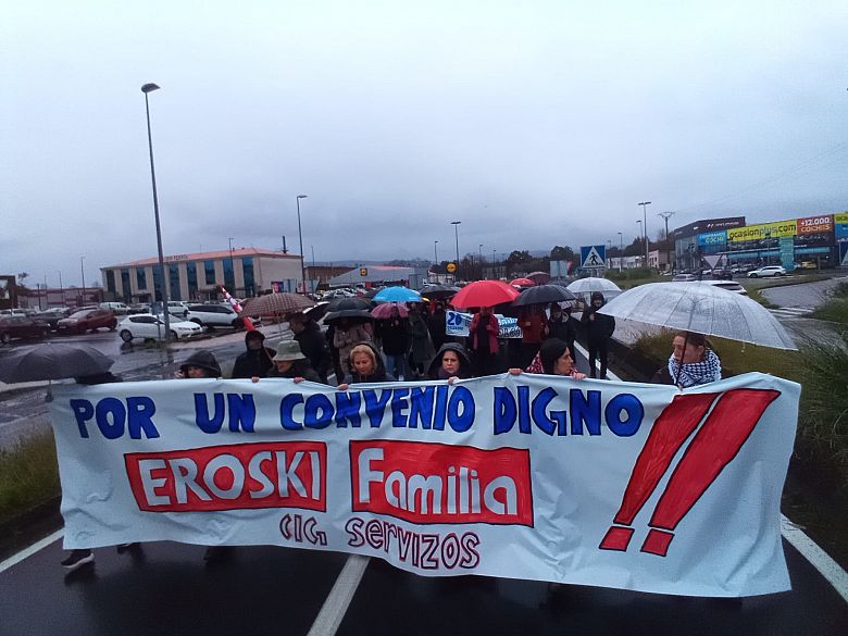 Na Coruña, centos de persoas saíron en manifestación dende o Eroski de Vioño, en Ferrol a manifestación partiu do Eroski do polígono da Gándara, en Compostela fíxose unha concentración no Eroski da Choupana e en Ribadeo a protesta foi diante do propio centro de traballo.