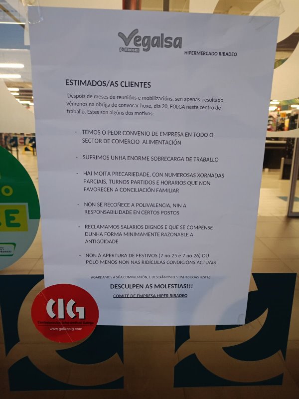 A folga afecta aos centros Vegalsa-Eroski da provincia da Coruña (agás Eroski City que son franquías) e ao hipermercado que a empresa ten en Ribadeo. Para darlle máis visibilidade á súa loita, as traballadoras e traballadores mobilizáronse este mediodía ao berro de “traballo por tres e non chego a fin de semana”, “Vegalsa paga mal e non deixa de explotar” ou “máis contratacións e mellores condicións”.