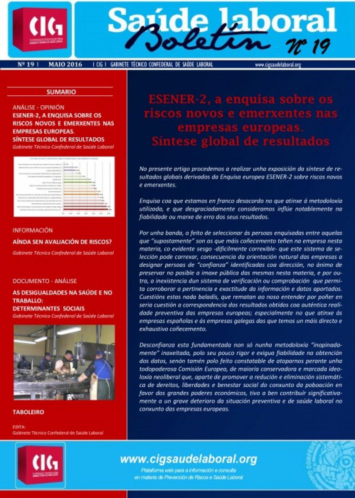 Na publicación exponse tamén unha síntese de resultados globais da Enquisa europea ESENER-2 sobre riscos novos e emerxentes. Enquisa coa que se advirte que “estamos en franco desacordo no que atinxe á metodoloxía utilizada, e que, desgraciadamente, consideramos inflúe notablemente na fiabilidade ou marxe de erro dos seus resultados”.