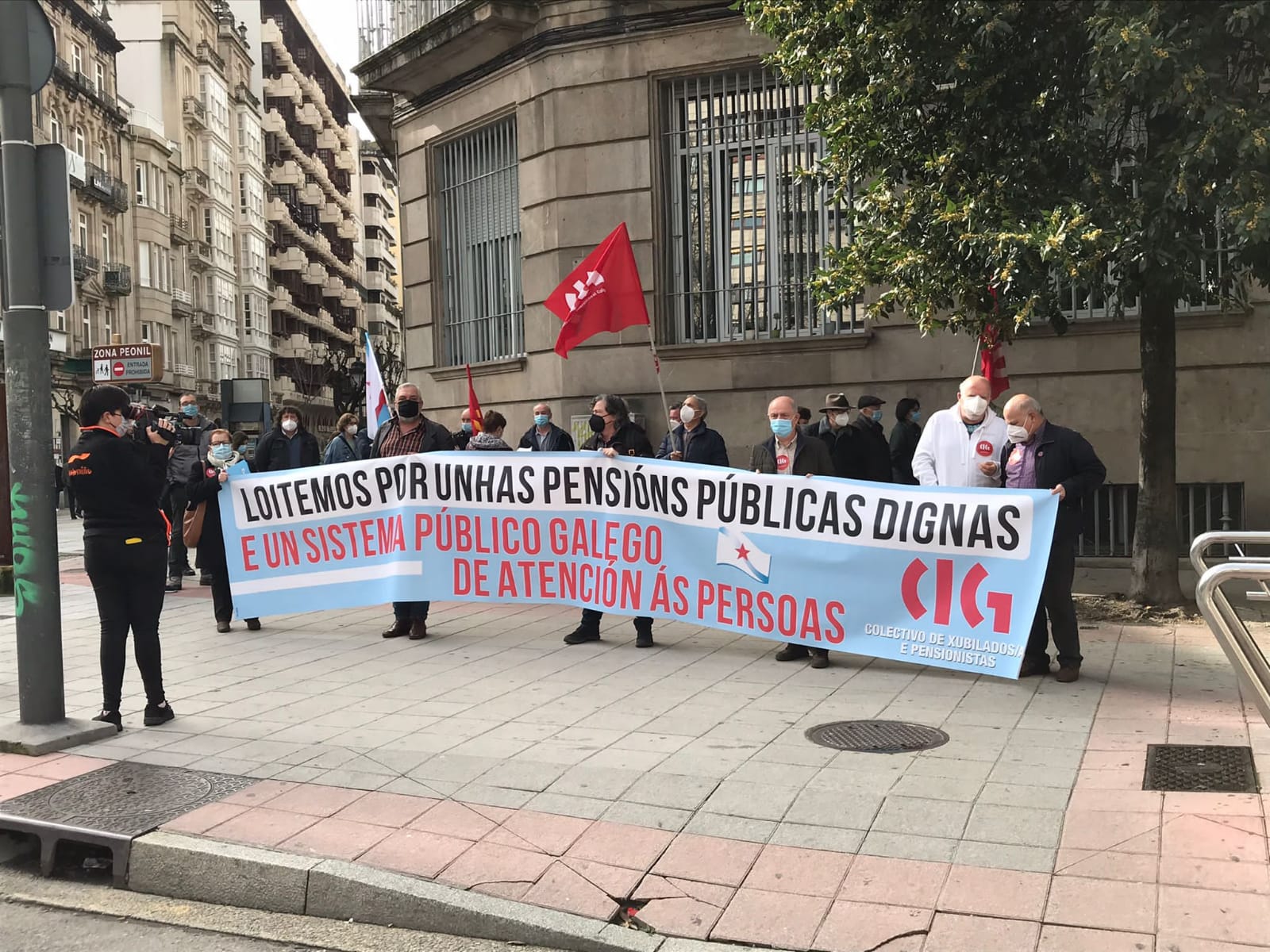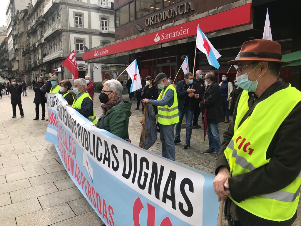 O colectivo de pensionistas e xubilados/as da CIG mobilizouse esta mañá nas sete cidades galegas e Cangas en demanda de que se equipare a contía da pensión mínima ao SMI; un servizo público galego de atención ás persoas; o incremento dos orzamentos destinados á atención á dependencia e o aumento de prazas públicas de Centros de Día e Residencias, entre outras.