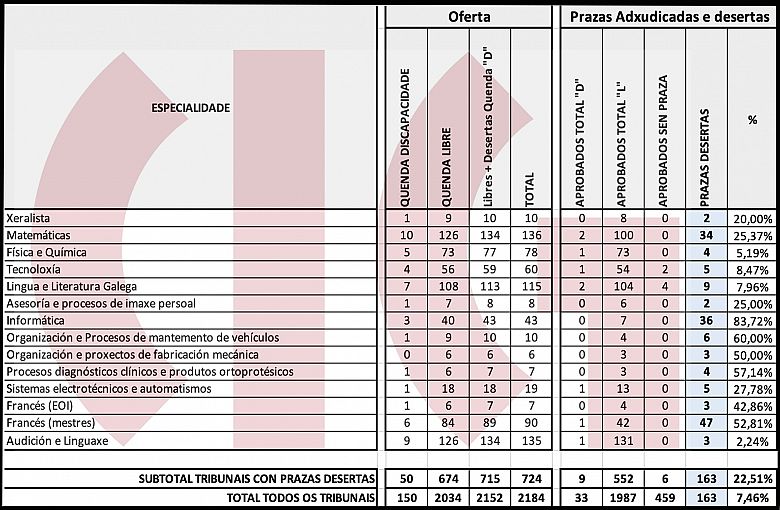 Se temos en conta unicamente as 14 especialidades nas que quedan prazas sen cubrir a porcentaxe de prazas desertas elévase a máis do 22%. En especialidades como Informática, xa destacada no anterior informe do sindicato, as prazas desertas son máis do 83% do total.