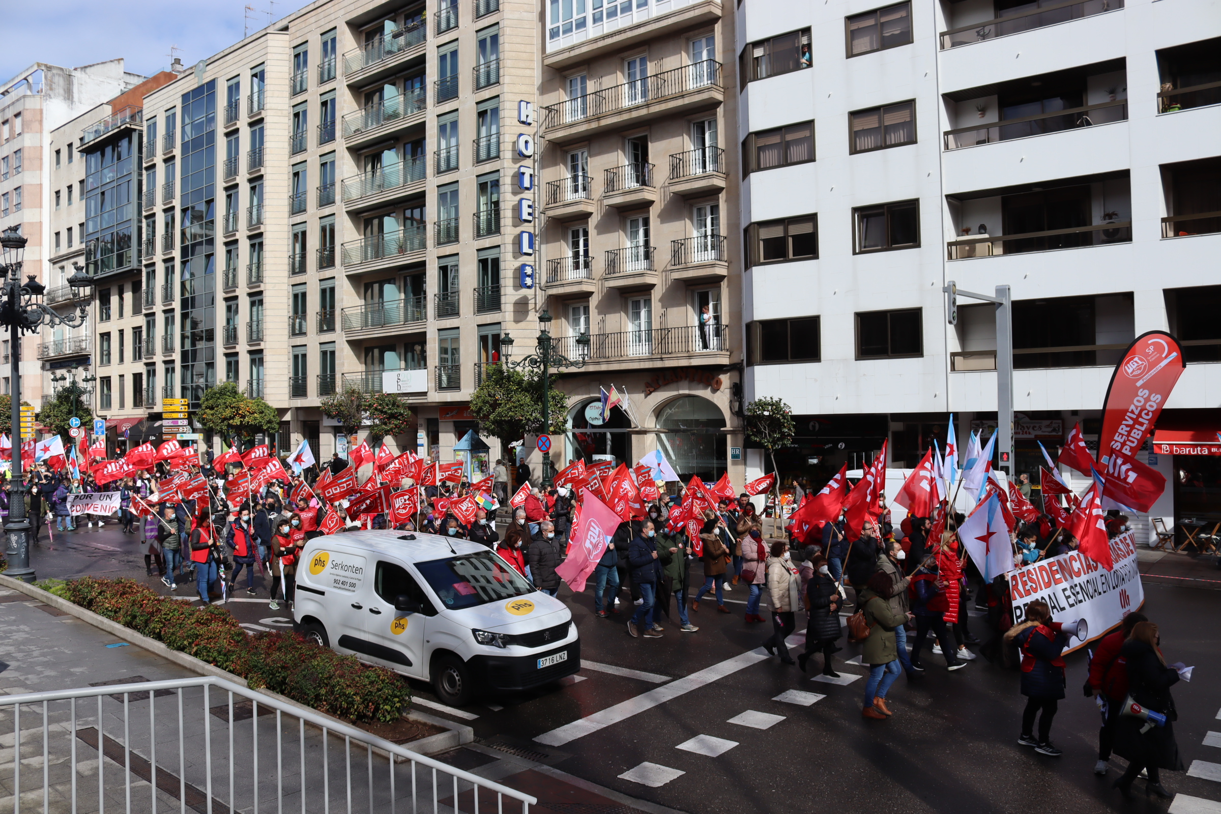 O persoal das residencias da terceira idade e centros de día privados fixo hoxe unha demostración de forza ao tomar as rúas de Vigo para reclamar un convenio colectivo digno que remate coa precariedade laboral no sector. Varios centos de traballadoras/es percorreron a pé a distancia entre a residencia Ballesol, na Gran Vía, e as oficinas centrais da empresa DomusVI, na rúa García Barbón, para forzar a patronal a negociar.