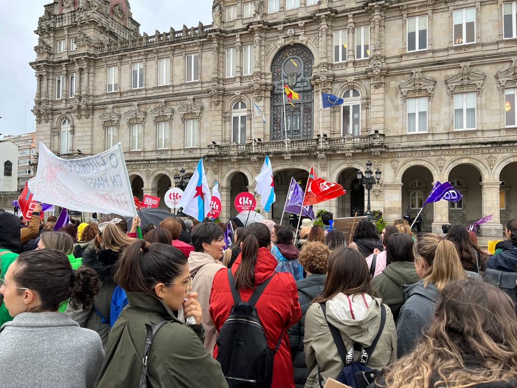 García critica os abusivos servizos mínimos impostos polo Goberno do PSOE no Concello da Coruña -os mesmos que decretou o PP para as escolas do Consorcio Galego de Igualdade e Benestar e no Concello de Arteixo-, que "vulneran o dereito á folga das traballadoras". Tras do primeiro día de folga, a representación sindical dirixiuse ao Concello da Coruña para que se rectificaran estes mínimos, pero finalmente o Goberno municipal desatendeu a petición. Por iso hoxe, a manifestación, que saíu da Praza de Pontevedra, rematou ás portas do Pazo de María Pita para amosar o malestar das traballadoras coa actitude do Goberno de Inés Rey.