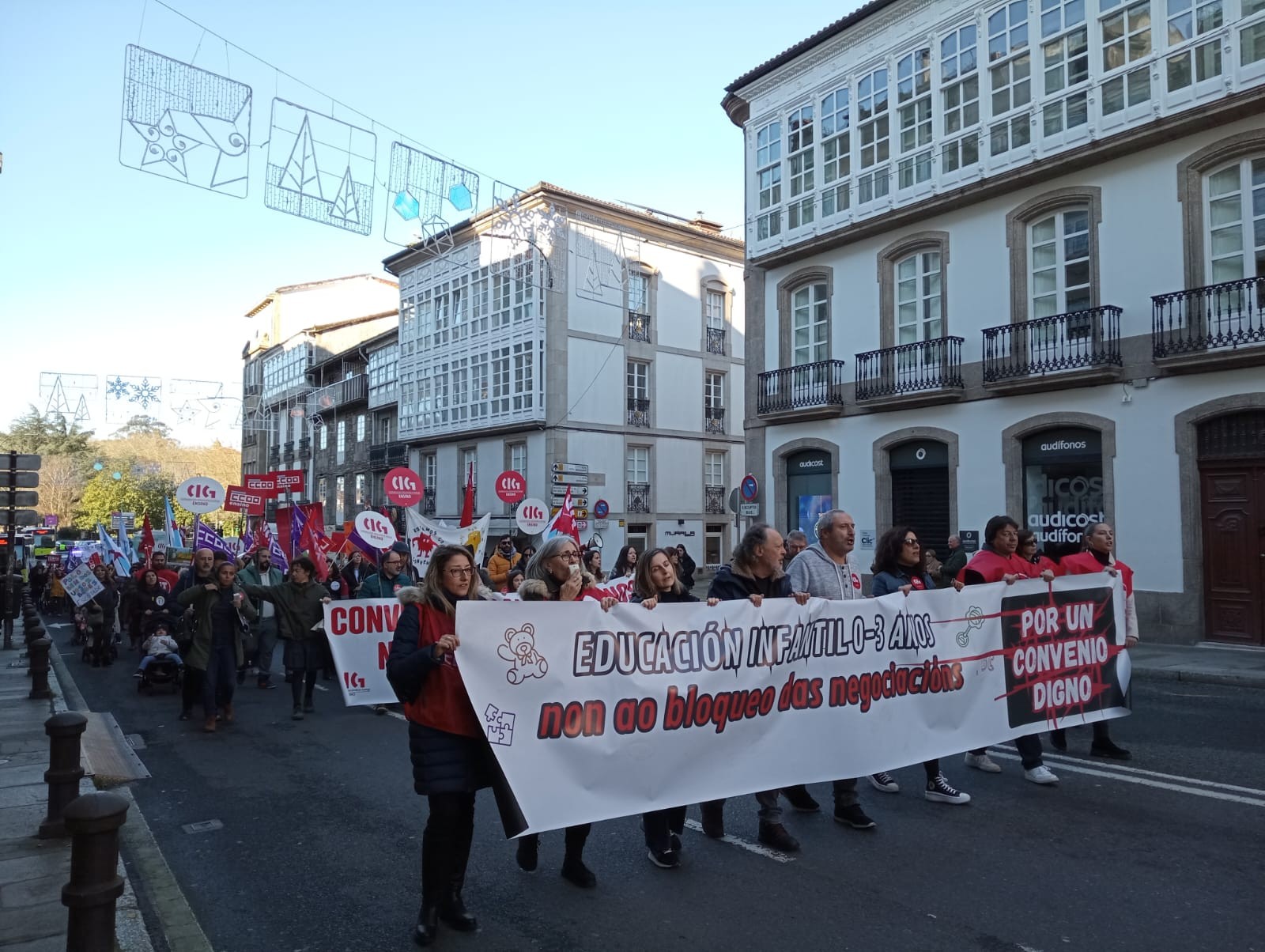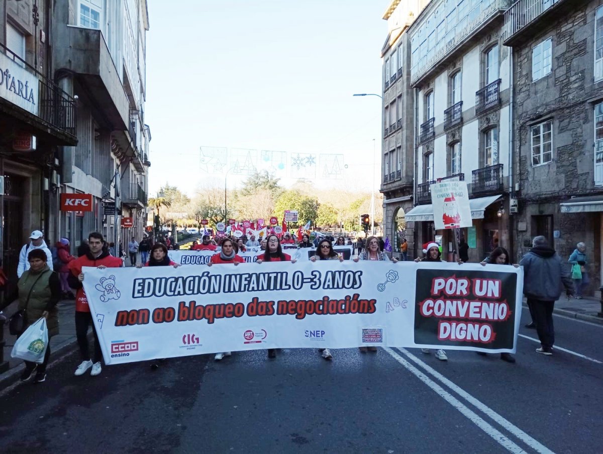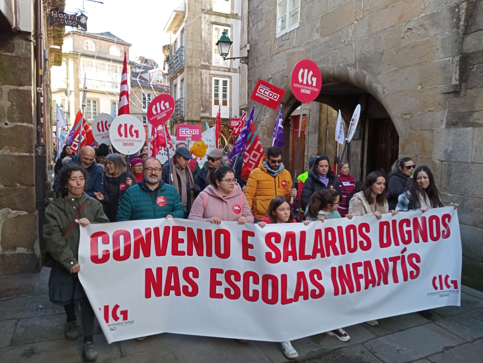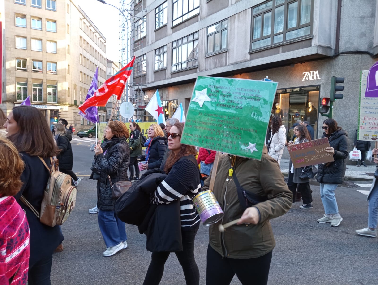 Na marcha, que transcorreu desde a Alameda até a praza de Praterías compostelá, con parada fronte á sede da Confederación de Empresarios de Galiza, na Rúa do Vilar, tiveron un protagonismo relevante os cartaces e as faixas nas que se podían ler reivindicacións como: “Convenio xusto, salarios dignos”; “Non coidamos, educamos”; “Se sobe o IPC, os salarios tamén” ou “A miña vocación non paga facturas”.
