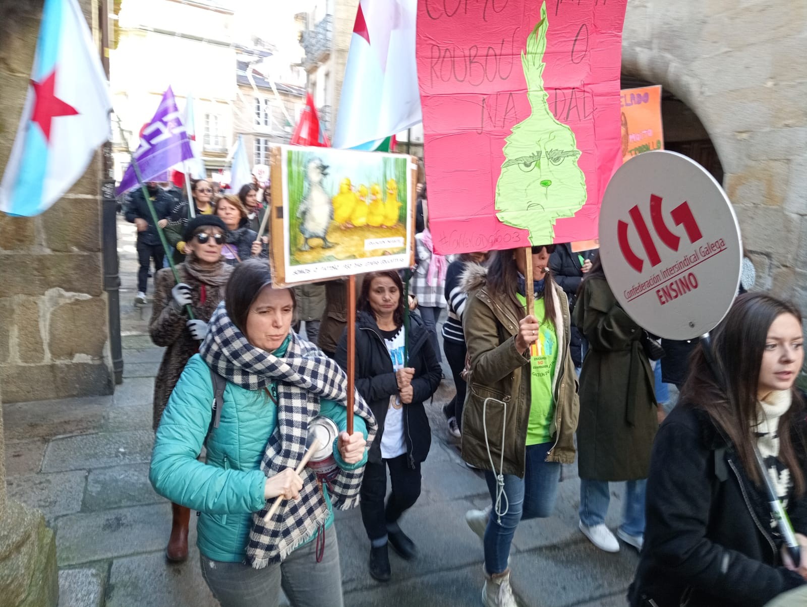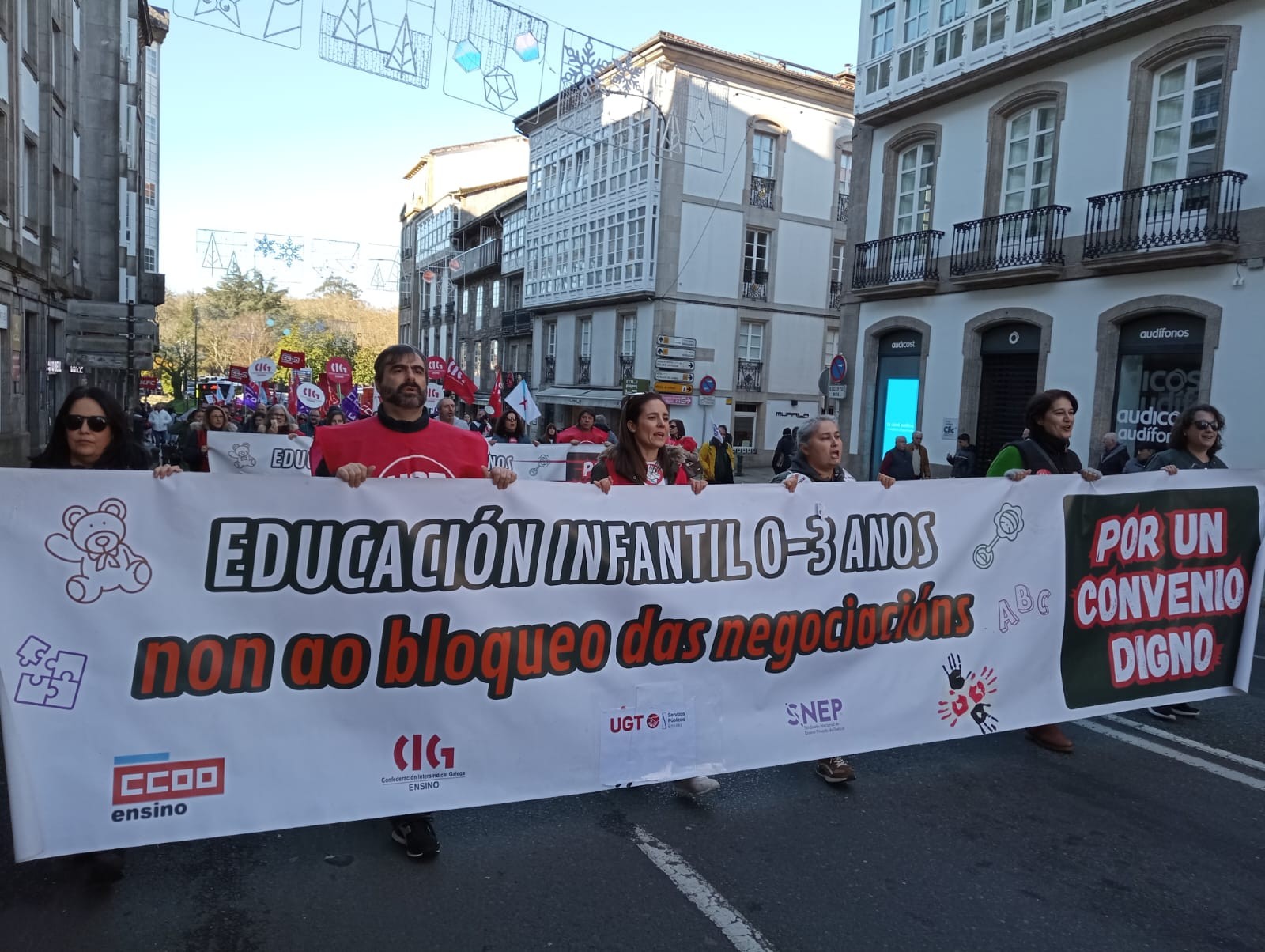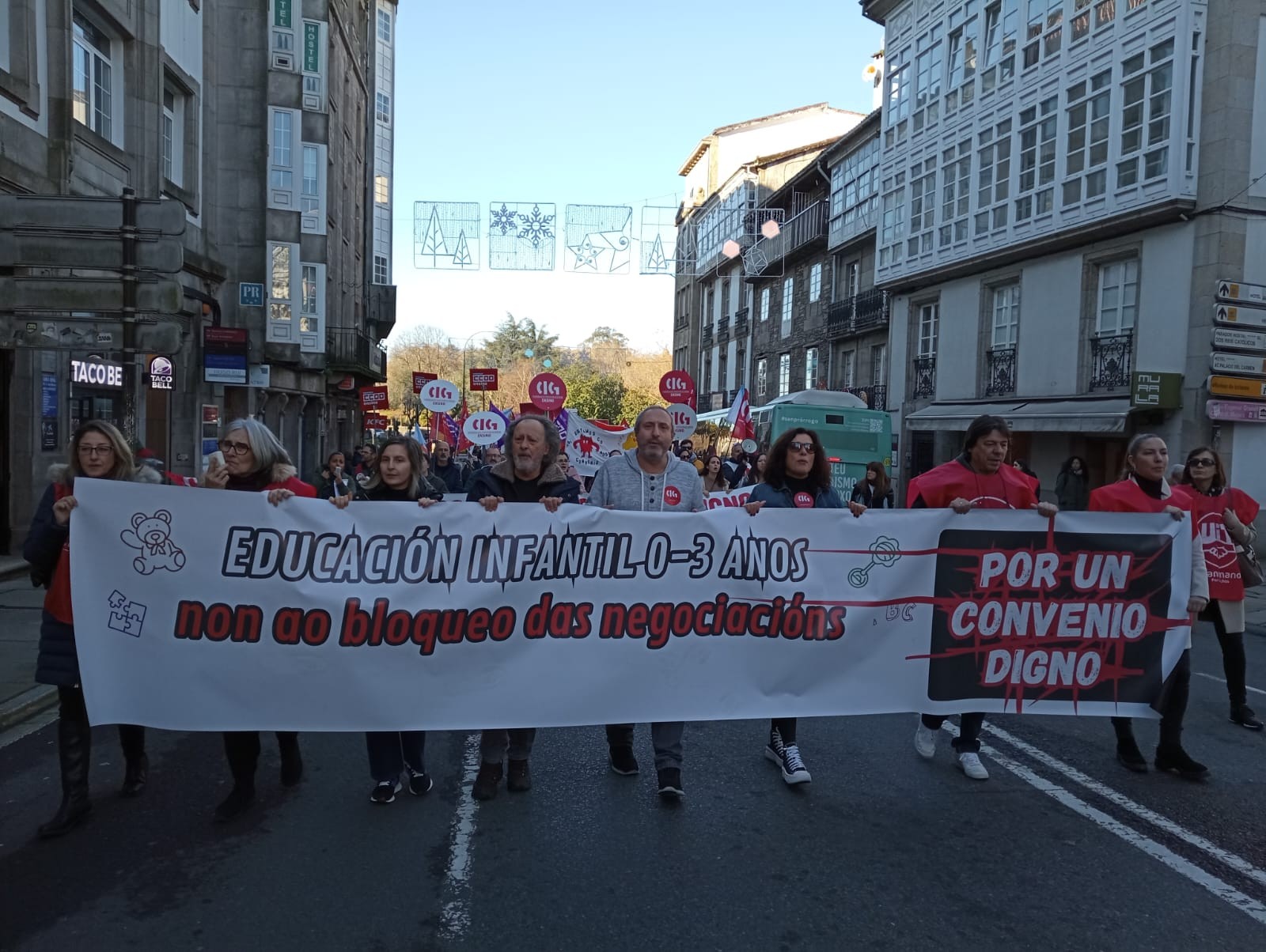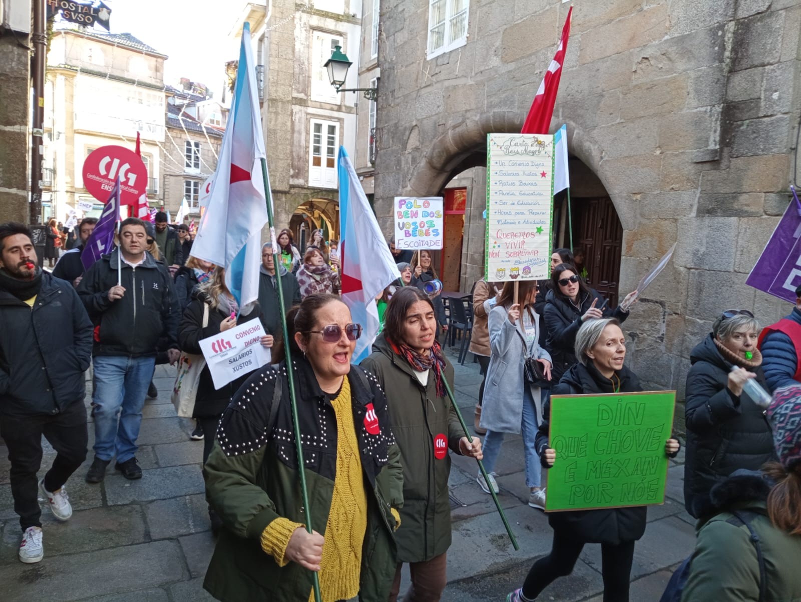 Na marcha, que transcorreu desde a Alameda até a praza de Praterías compostelá, con parada fronte á sede da Confederación de Empresarios de Galiza, na Rúa do Vilar, tiveron un protagonismo relevante os cartaces e as faixas nas que se podían ler reivindicacións como: “Convenio xusto, salarios dignos”; “Non coidamos, educamos”; “Se sobe o IPC, os salarios tamén” ou “A miña vocación non paga facturas”.