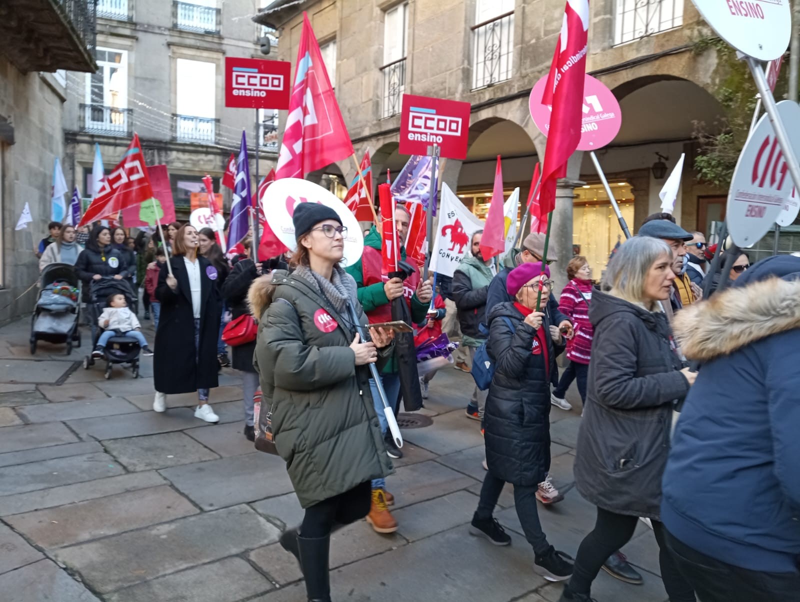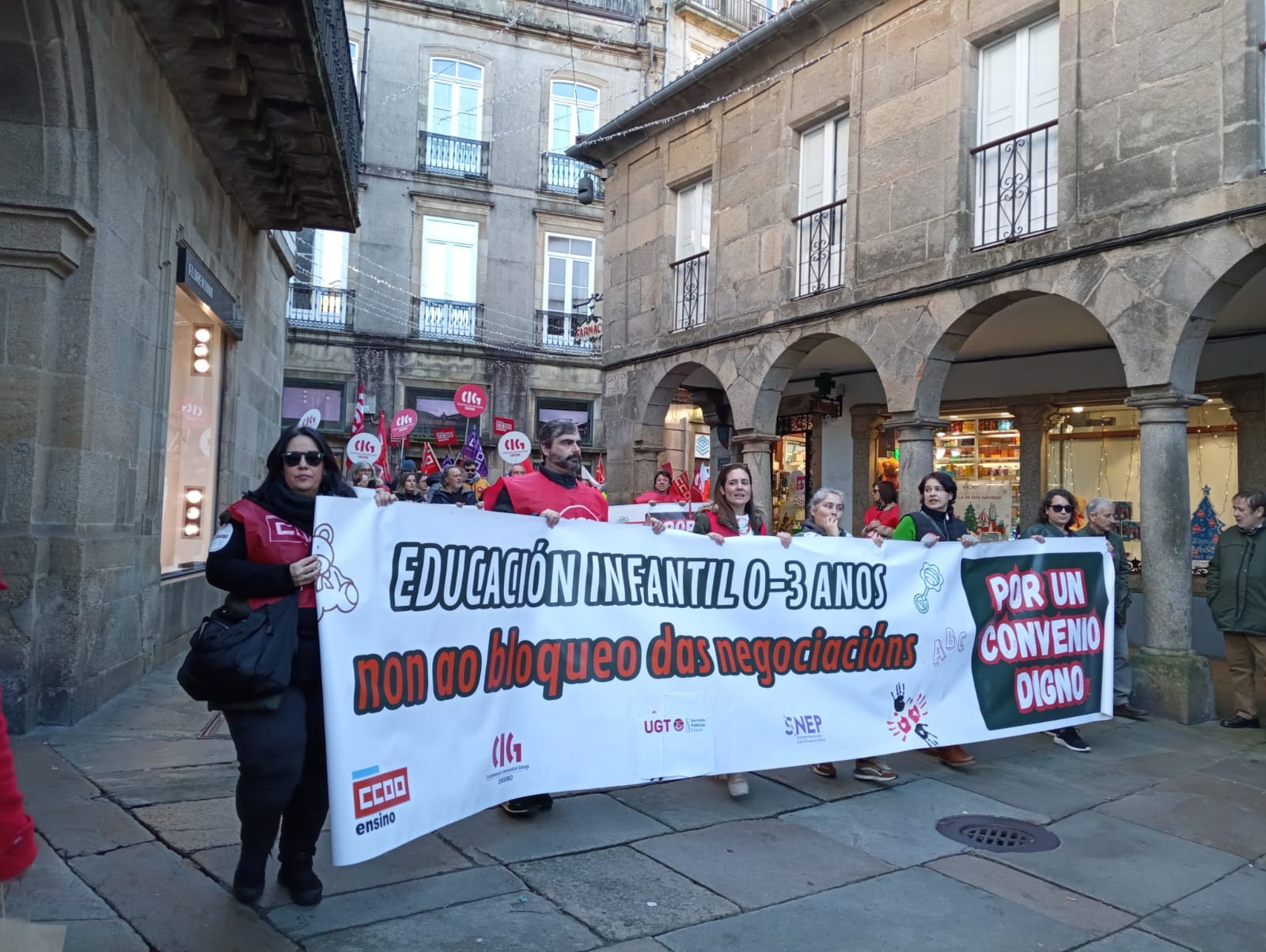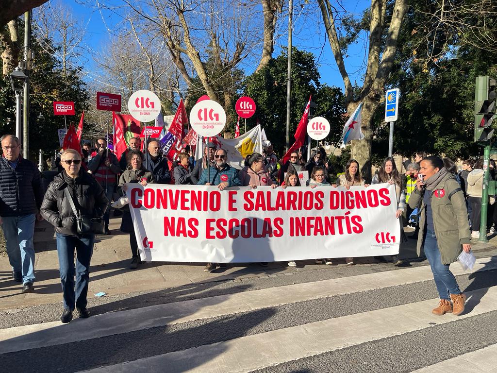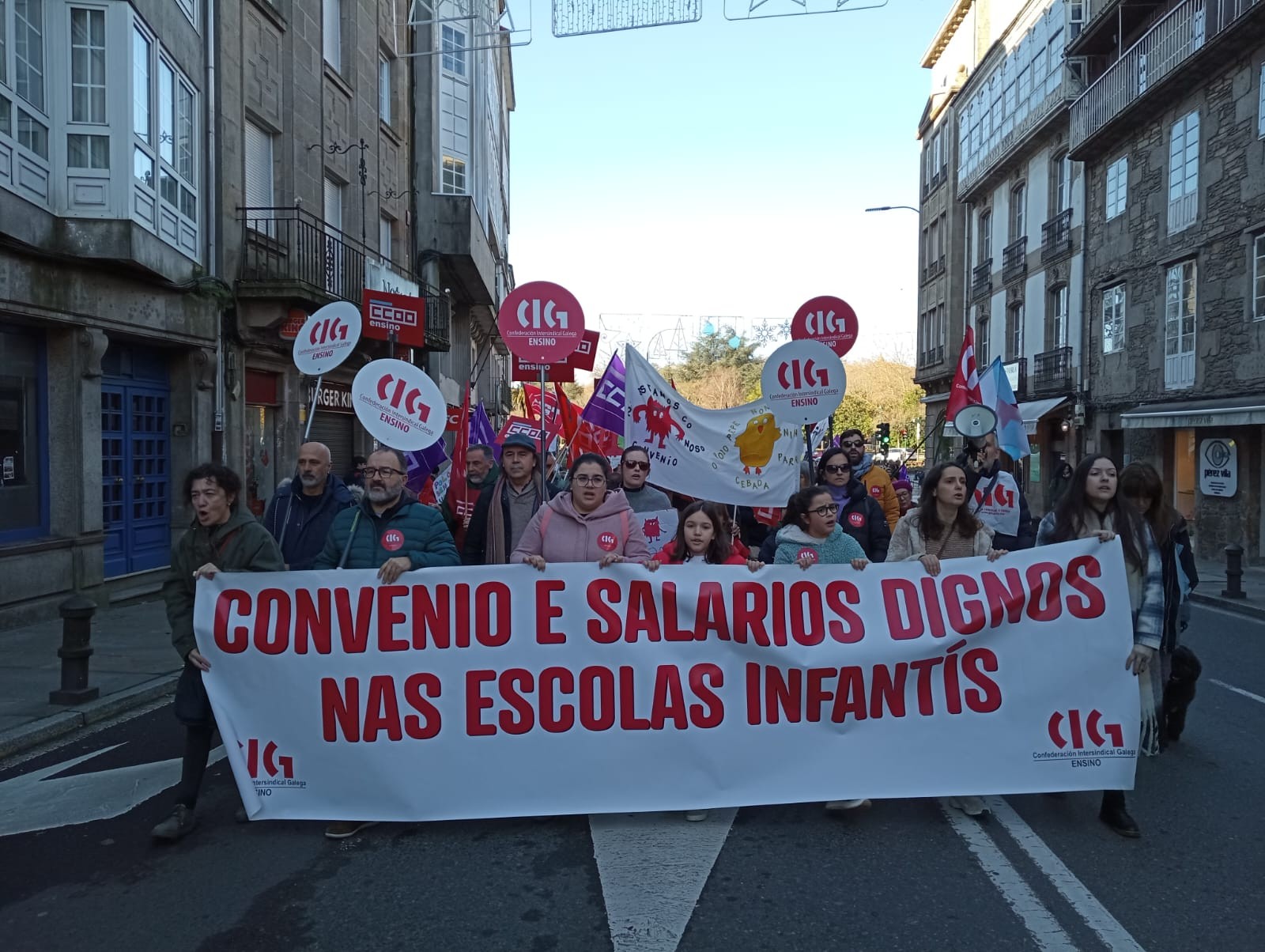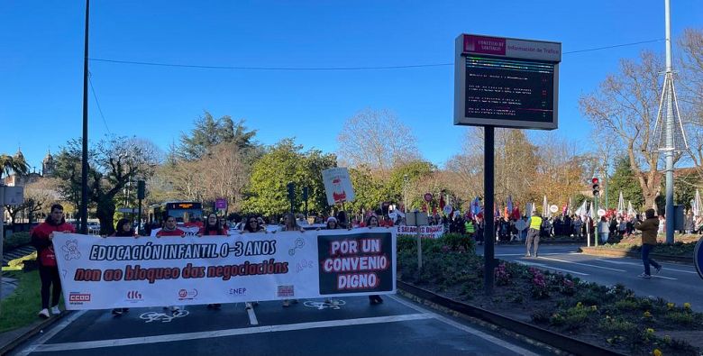 Na marcha, que transcorreu desde a Alameda até a praza de Praterías compostelá, con parada fronte á sede da Confederación de Empresarios de Galiza, na Rúa do Vilar, tiveron un protagonismo relevante os cartaces e as faixas nas que se podían ler reivindicacións como: “Convenio xusto, salarios dignos”; “Non coidamos, educamos”; “Se sobe o IPC, os salarios tamén” ou “A miña vocación non paga facturas”.