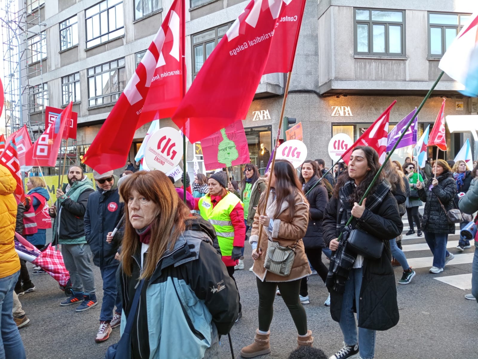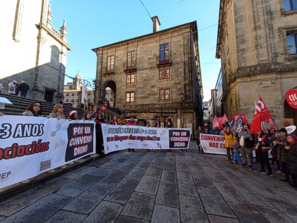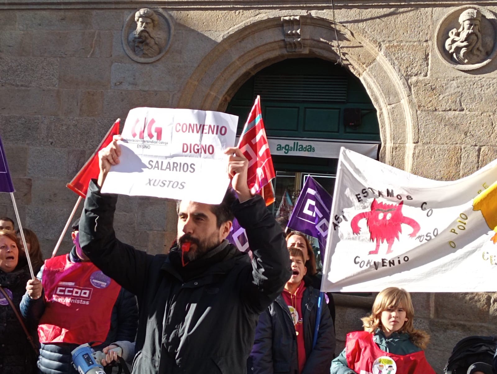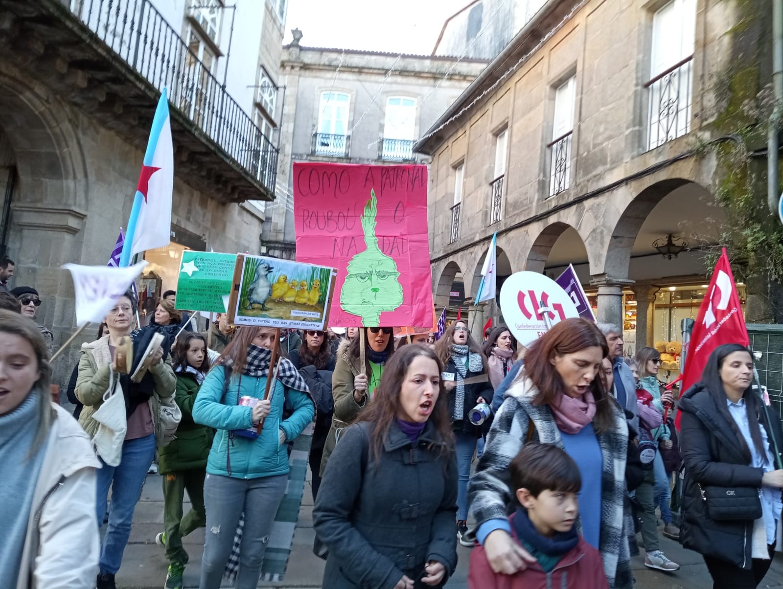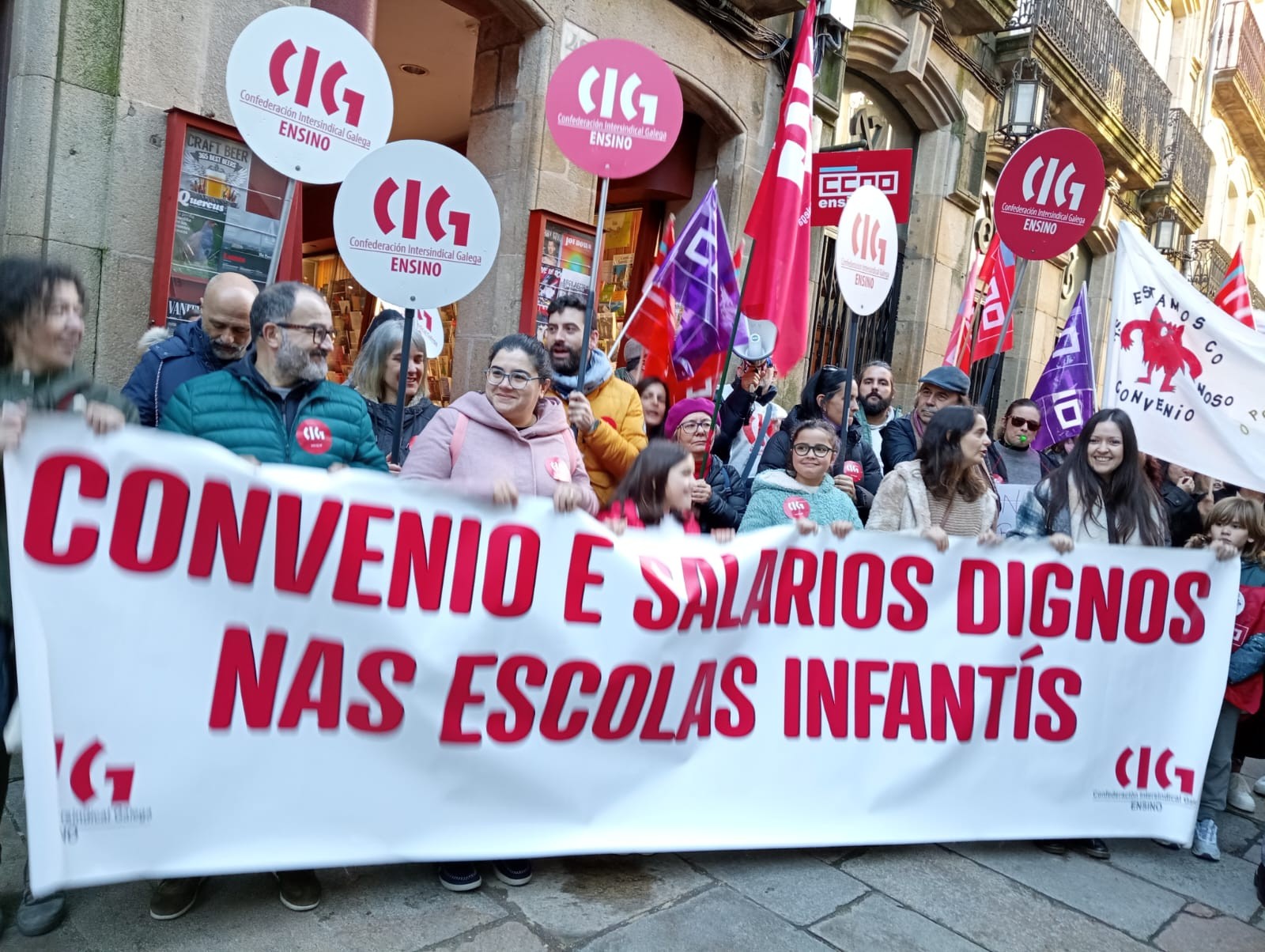 Na marcha, que transcorreu desde a Alameda até a praza de Praterías compostelá, con parada fronte á sede da Confederación de Empresarios de Galiza, na Rúa do Vilar, tiveron un protagonismo relevante os cartaces e as faixas nas que se podían ler reivindicacións como: “Convenio xusto, salarios dignos”; “Non coidamos, educamos”; “Se sobe o IPC, os salarios tamén” ou “A miña vocación non paga facturas”.