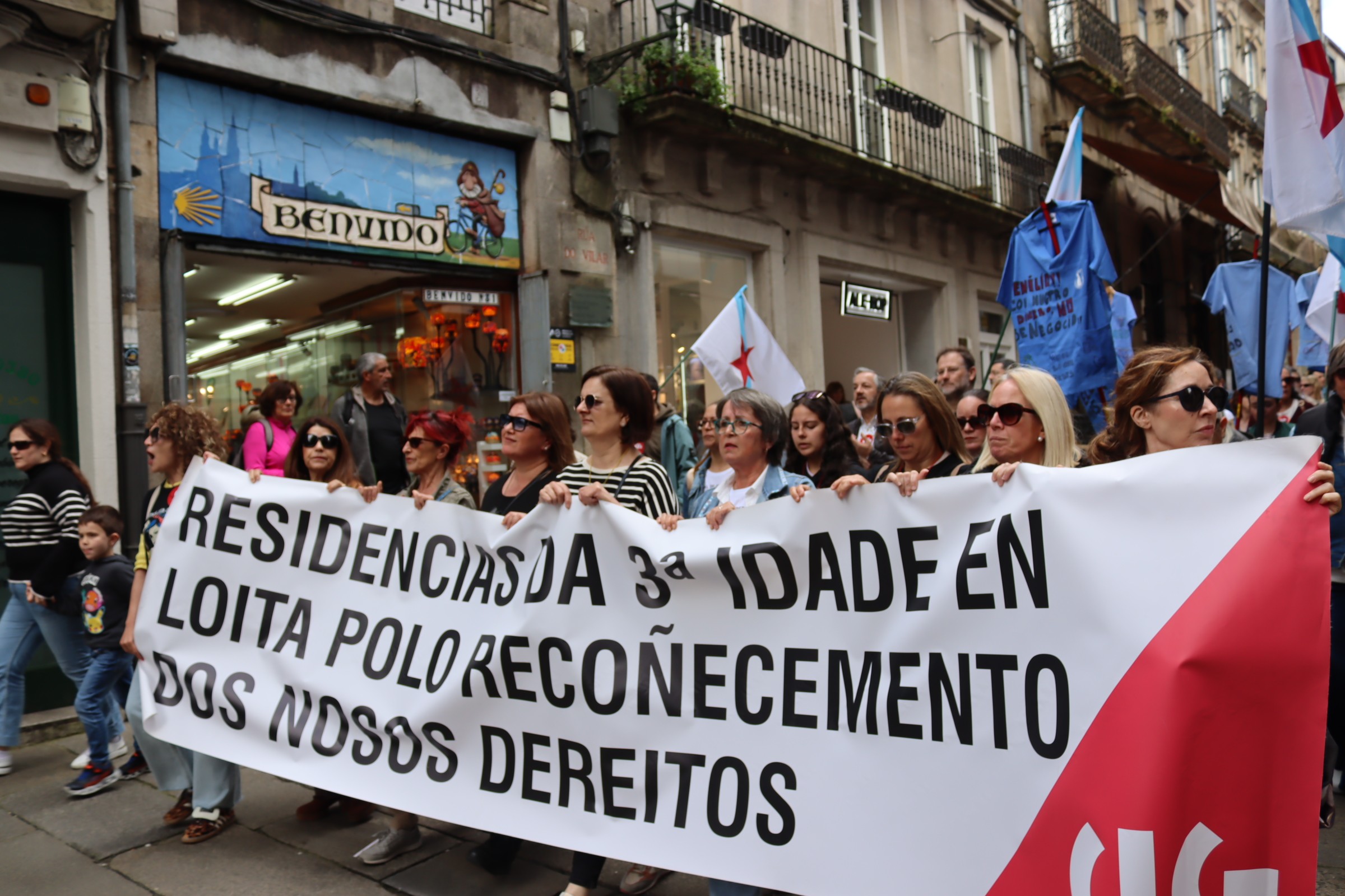 Traballadoras de residencias privadas de maiores e do Servizo de Axuda no Fogar (SAF) percorreron esta mañá as rúas de Compostela nunha manifestación convocada pola CIG-Servizos para esixir un convenio colectivo que dignifique as súas condicións laborais e garanta unha atención de calidade ás persoas dependentes. A protesta, que partiu ás 11:00 horas desde a Alameda e rematou na Praza de Praterías, congregou a traballadoras de toda Galiza, que denunciaron a precariedade laboral, os baixos salarios e a falta de compromiso tanto da patronal como da Xunta de Galicia.