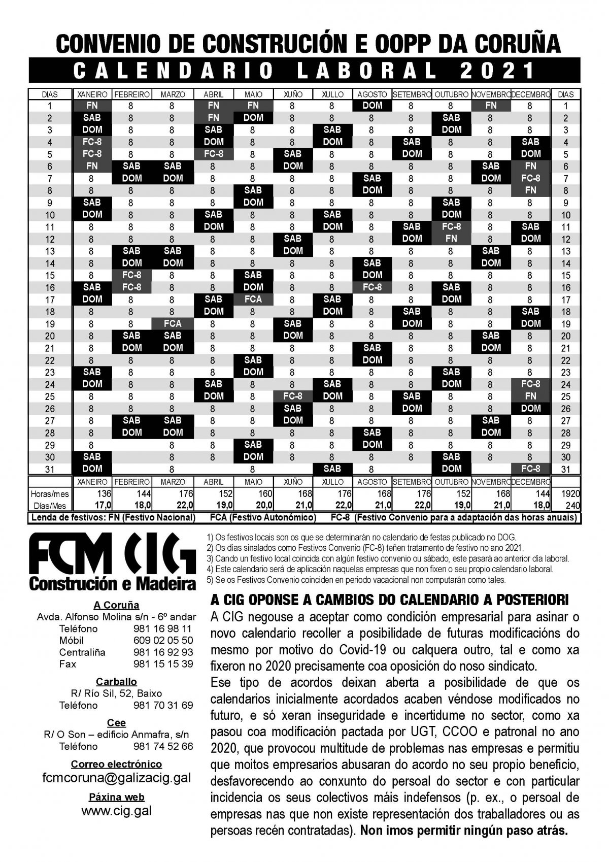 A FCM-CIG negouse a aceptar a condición empresarial para asinar o novo calendario de recoller a posibilidade de futuras modificacións deste por motivo da covid-19 ou calquera outro, tal e como fixeron en 2020 precisamente coa oposición da CIG.