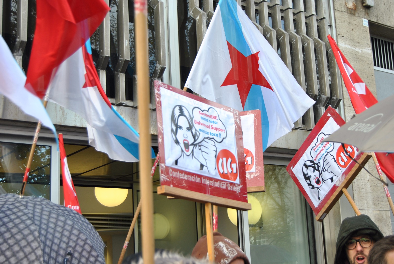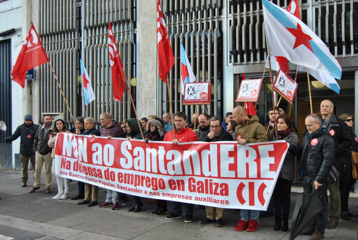 Delegadas e delegados da CIG concentráronse este xoves diante do centro de coordinación do Popular-Pastor contra o ERE que pretende aplicar o Santander nesta entidade. A central sindical denuncia que as negociacións seguen avanzando sen ter en conta a realidade das persoas afectadas nos centros de traballo en Galiza, xa que o persoal procedente do Popular parte de salarios menores.