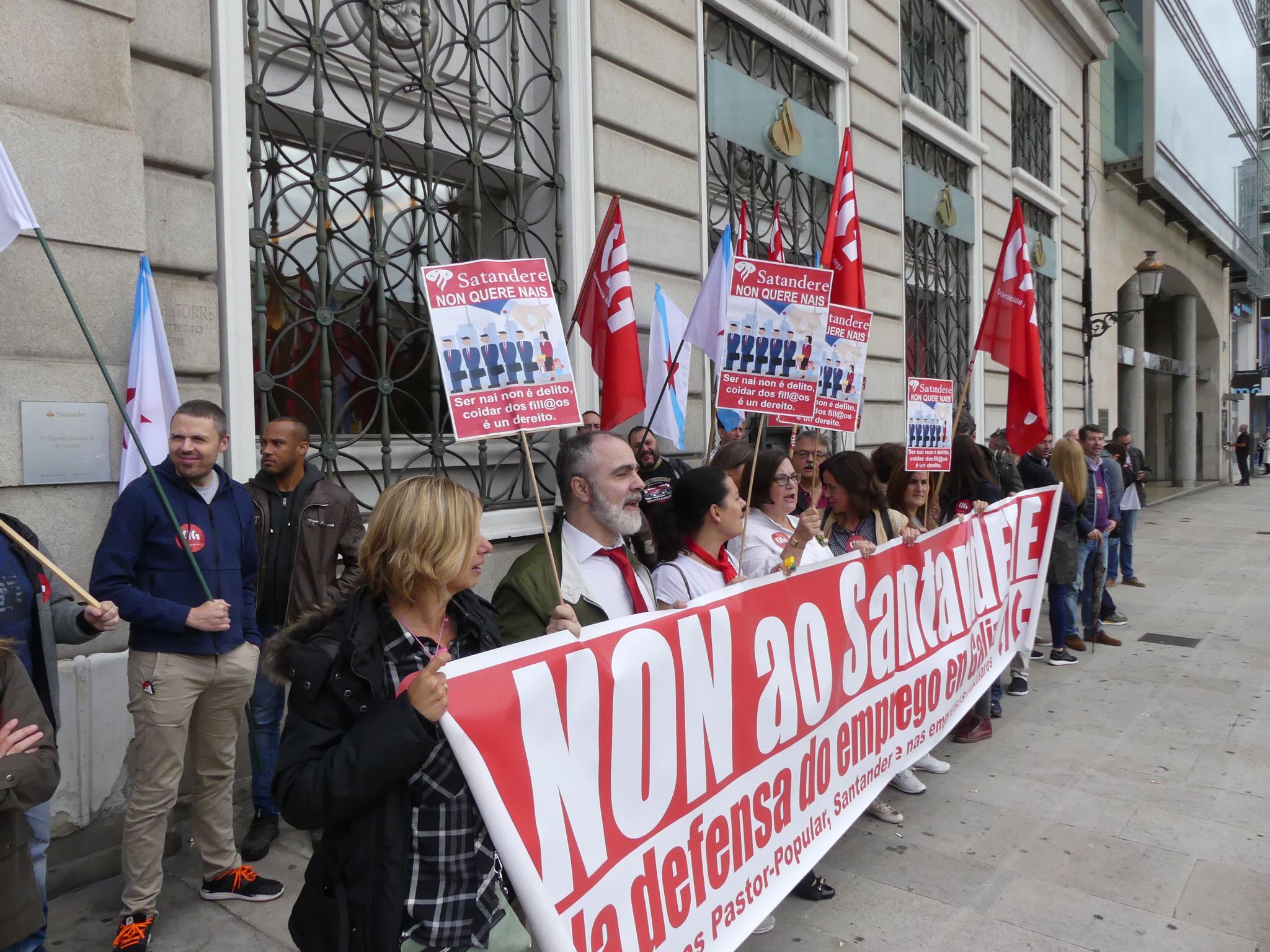 A sección sindical da CIG no Banco Santander desenvolveu este venres na Coruña unha xornada de mobilizacións diante de varias oficinas da entidade para denunciar a política laboral do banco, pois malia asegurar que o principio da "voluntariedade" ía presidir esta nova regulación de emprego, na realidade "está presionando, coaccionando e mesmo ameazando" a determinado persoal (na maioría dos casos traballadoras acollidas a medidas de conciliación, como a redución de xornada por coidado de menores) para "instalo" a que marche. De xeito paralelo, a entidade rexeita de maneira sistemática moitas das solicitudes de adscrición voluntarias ao ERE presentadas polo persoal con máis de 55 anos.
