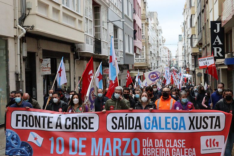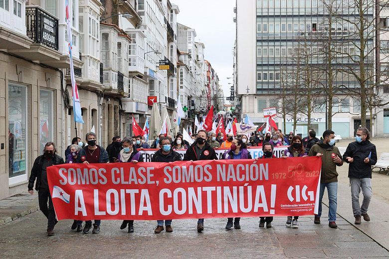 Delegadas e delegados da CIG procedentes de toda Galiza manifestáronse este xoves polas rúas de Ferrol con motivo do 10 de Marzo, Día da Clase Obreira Galega. Unha data de reivindicación e combate que este ano ten un especial significado ao cumprirse o 50 aniversario das loitas obreiras de 1972, xerme do sindicalismo nacionalista que hoxe representa a CIG. De aí que o lema escollido pola central para esta data sexa "Somos clase, somos nación. A loita continúa".