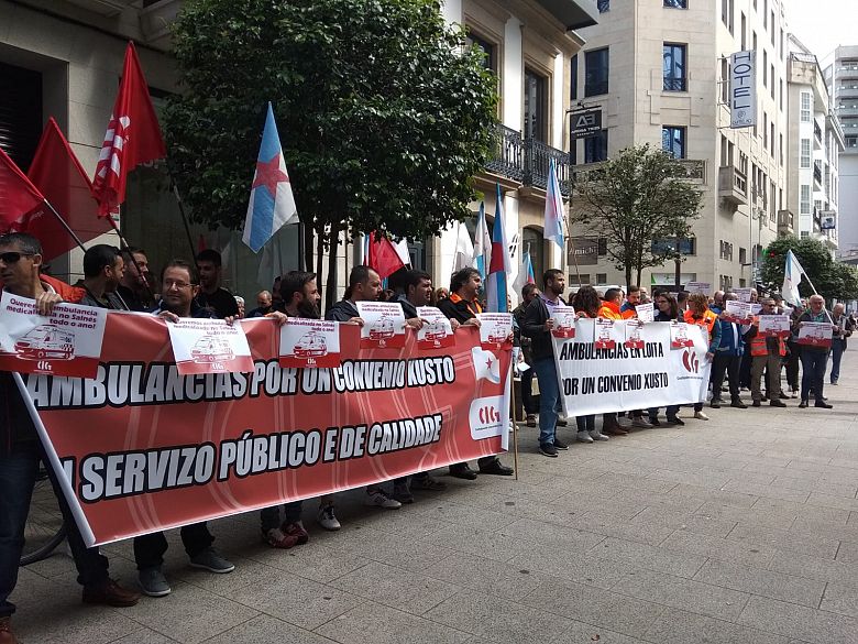 Ao remate desta última os delegados/as sairán en manifestación até o hospital Provincial en apoio da loita do persoal do transporte sanitario, que convocou varias xornadas de folga para reclamar un convenio digno. Hoxe mesmo, ao finalizar a asemblea de Vilagarcía, os asistentes tamén se mobilizaron fronte á sede do PP en solidariedade cos traballadores/as das ambulancias.