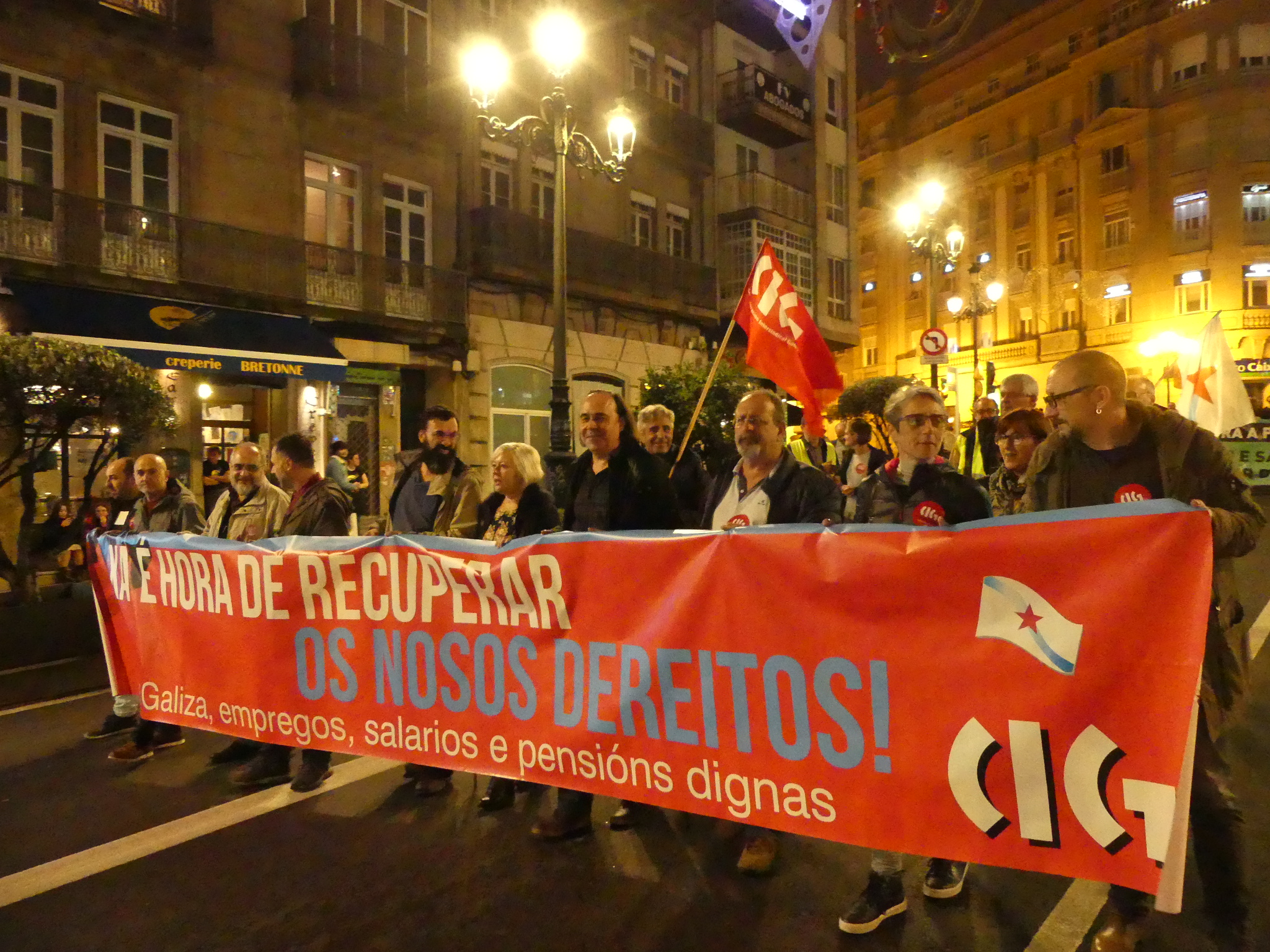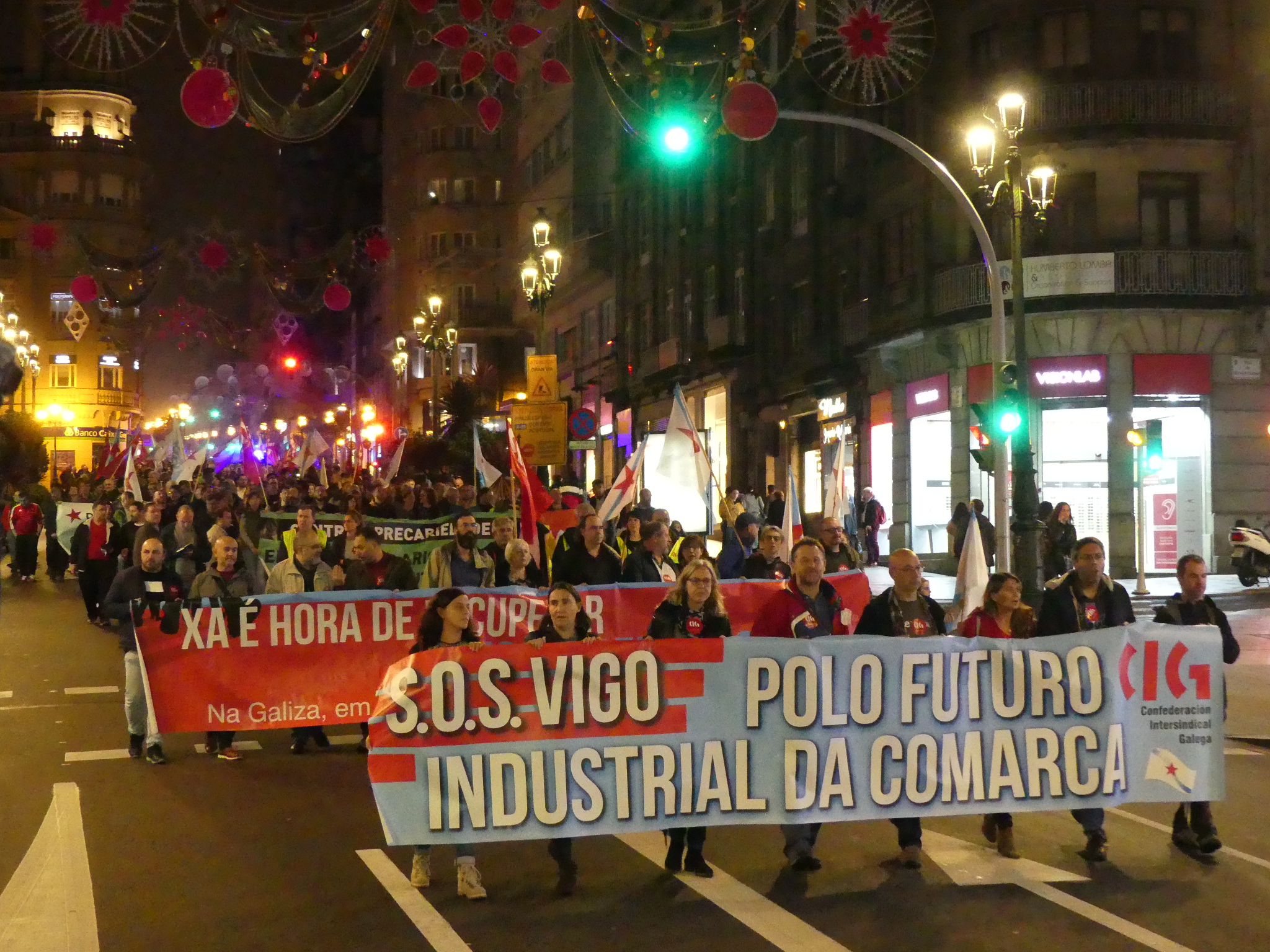Arredor dun milleiro de persoas botáronse hoxe ás rúas de Vigo convocados pola CIG para lanzar un S.O.S ante a grave crise que atravesa a industria da bisbarra, especialmente o sector naval e a automoción, con constante perda de emprego e crecente precarización laboral. O secretario comarcal, Alberto Gonçalves, reclamou medidas "urxentes e eficaces" ao Goberno central e á Xunta para garantir o futuro industrial, o emprego digno e os servizos públicos.
