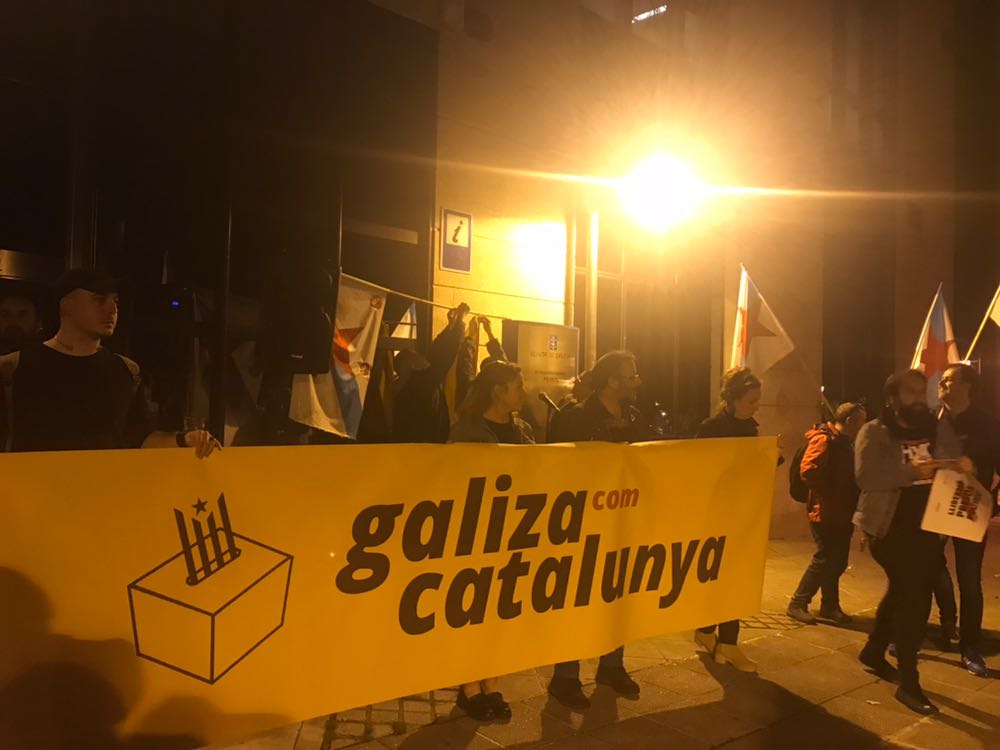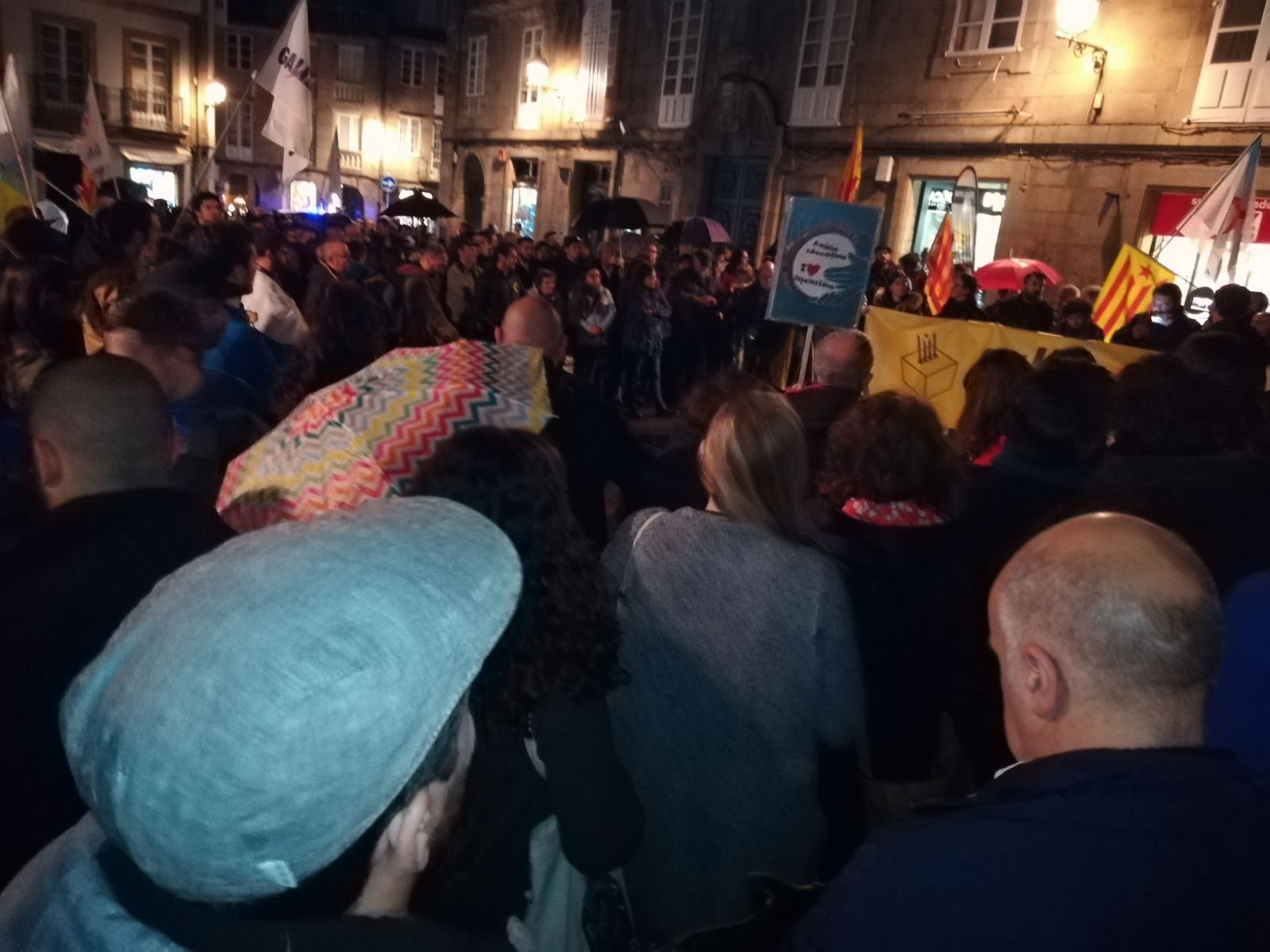 A loita do pobo catalán e tamén a nosa loita. Por iso, hoxe desde Galiza querémoslle mandar ao conxunto do pobo catalán, e moi especialmente aos que hoxe están na cadea polas súas ideas e a defensa dun mandato popular, unha mensaxe de solidariedade, de apoio e de ánimo. Desde Galiza, decímoslle aos inquisidores do século XXI que a non hai texto legal nin aparello coharcitivo capaz de contar as ansias de liberdade e democracia dunh pobo. dicimos, alto e claro, Si á Catalunya como Estado independente en forma de República e Si á democracia e SI á saida inmediata de presión dos presidentes da ANC, Ominium e os membros do Govern encarceados.