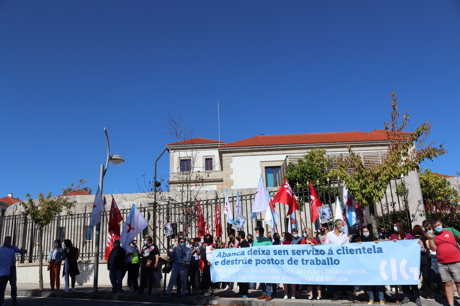 A CIG-Abanca concentrouse esta mañá en San Caetano, fronte á consellaría de Facenda, para manifestar a súa oposición ás subvencións que a Xunta de Galicia aprobou dar ao Banco para a instalación e mantemento de caixeiros automáticos e a contratación de axentes, en lugares onde Abanca pecha oficinas e destrúe emprego.