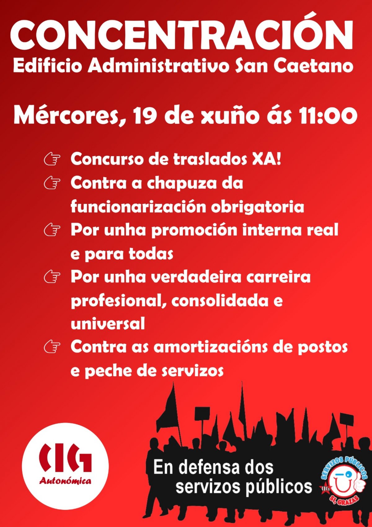 A CIG-Administración Autonómica ten convocada para este mércores, día 19 de xuño, ás 11:00 horas, diante da consellaría de Presidencia, no edificio administrativo da Xunta de Galiza, en San Caetano, unha mobilización para denunciar a nefasta xestión de persoal de Función Pública; a “chapuza” da funcionarización orbrigatoria; as amortizacións de postos e o peche de servizos e exixir a convocatoria inmediata de concursos de traslado; procesos de promoción interna e unha verdadeira carreira profesional, consolidada e universal.