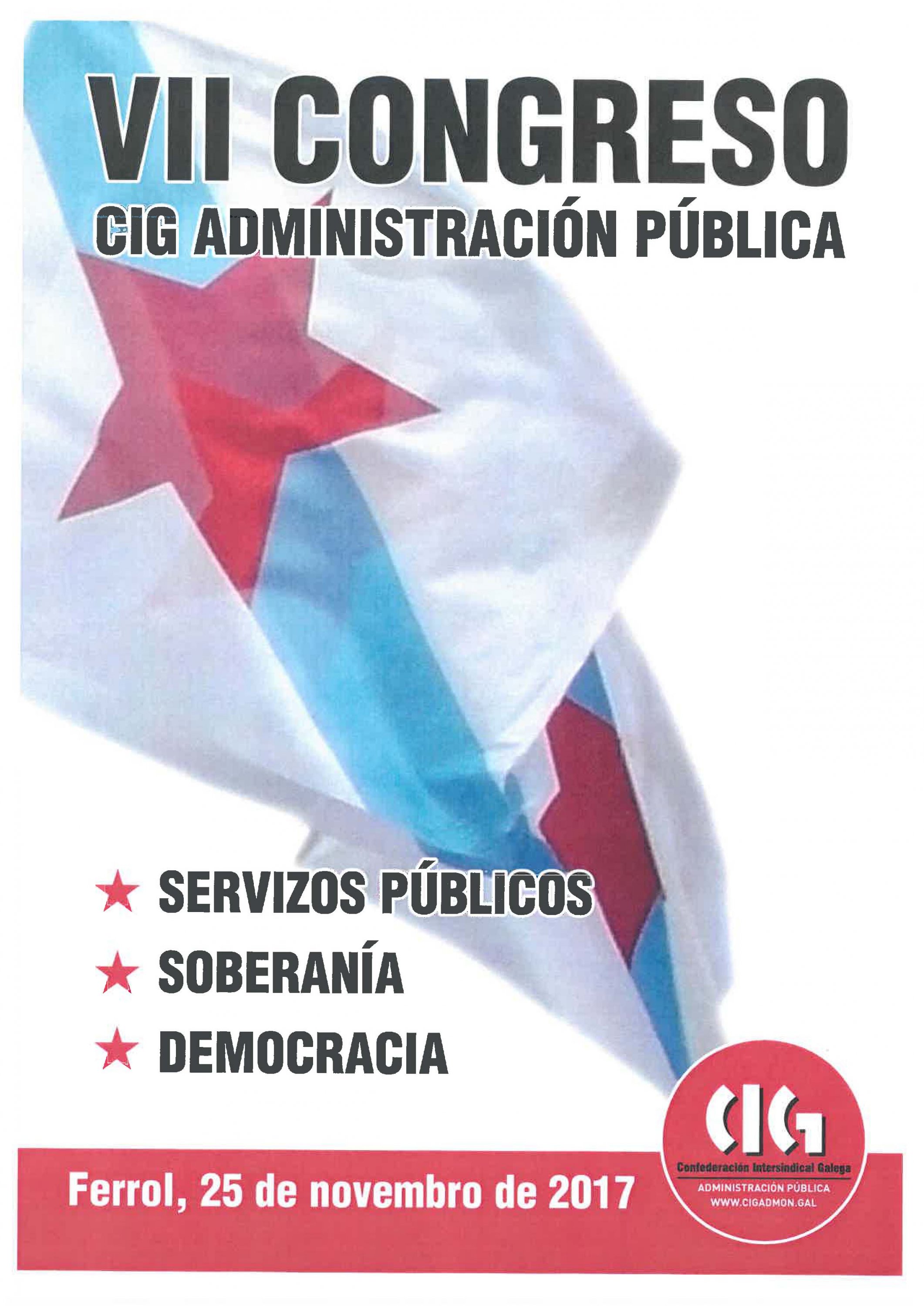 A CIG-Administración celebra o vindeiro sábado 25 de novembro, en Ferrol, o seu VII Congreso baixo o lema “Servizos Públicos, Soberanía e Democracia”. Unha xornada na que 204 delegados/as debaterán e acordarán as liñas de traballo para os vindeiros catro anos; renovarán o organismo de dirección, escollerán as/os representantes da federación no Consello Confederal e elixirán secretario/a nacional.