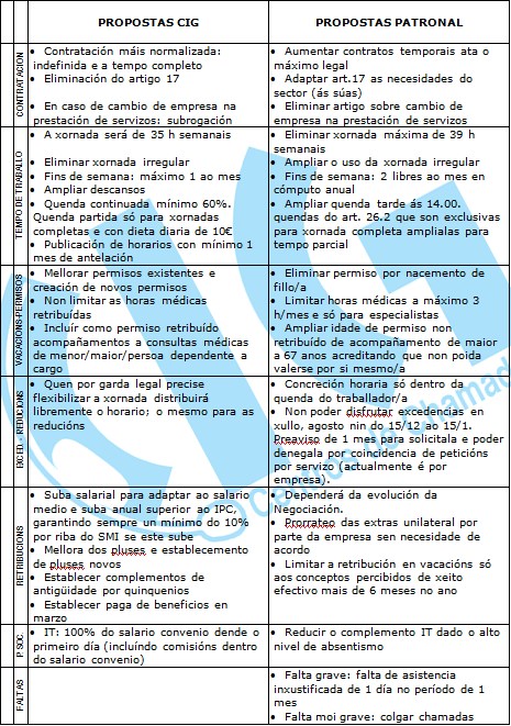 Como se pode comprobar na táboa, a plataforma presentada pola patronal “non é máis que unha batería de recortes”, afirma CIG-Banca, que denuncia que mentres por unha banda “din ter gran preocupación polos niveis de absentismo”, pola outra, “non fan nin unha soa proposta no ámbito da saúde laboral, onde nós temos a certeza de que radica o motivo do mesmo”.